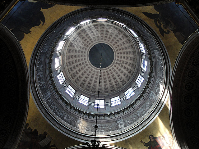 不知是因此堂身處繁華,還是地位崇高,殿內靜禱的人眾相當多。我緩踱著步,四面望看,列柱支起的挑高大廳寬廣且陰暗,有種清冷氣息旋遊,悠悠蕩蕩。殿心由於採光頂引進日照投射,總算攜來些明炫,它剔亮了拱座環帶的灰階人物敘事、長廊筒狀弧頂的鑲花六角格飾、柱頭繁麗的科林斯式翻葉、主祭壇上隱約的最後晚餐彩繪、而後落在雕工精細的聖像屏。