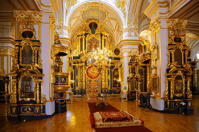 從廳門走進去,拱廊以巴洛克富麗壇座綴著,將畫作以螺柱曲頂框飾。而廳間的最末,是弧邊疊層成巒的聖像屏,門開著,有或許是主教抑或神父的神職人員正主持儀式。堂內人雖不多,但都虔敬端立,注視也默禱。我不敢褻瀆這份寧靜,故僅遠遠佇望。