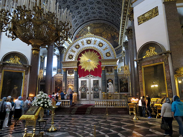 很可惜地,似乎俄羅斯多數仍維持禮拜功能的教堂都不許拍照,尤其是有儀式進行之時。此外,或許為避免褻瀆,販賣部就算擺置了明信片,亦不太有正對聖像屏之取景。所以總迫著眼前莊嚴廳堂、繁麗雕飾在我記憶裡飛快淡濛,只在看到官網照片之時,才勉強喚回些印彩。然留存於心的感受依舊,那氛圍空寂了雜念、屏棄了擾嚷,而當視線抓著光影,仰首追流而上,便有了力量。