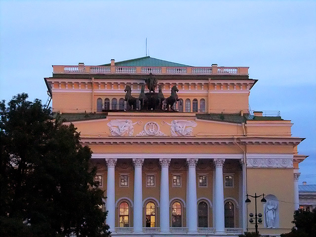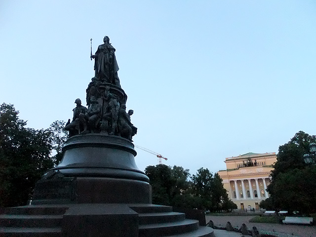 而街邊若由「凱薩琳花園」穿入,有座古典形貌的「亞歷山大德琳娜歌劇院」,今夜幾個團員經由導遊推薦,便是在此欣賞俄羅斯著名的芭蕾舞劇。其實當初調查時有些心動,但正如前年於維也納推掉聆聽音樂會的機緣,這會兒想了想也還是沒舉手,畢竟在不知良莠、不知舞碼的狀況下,還是寧可做些能自我掌控的事,去些想探訪的地方。