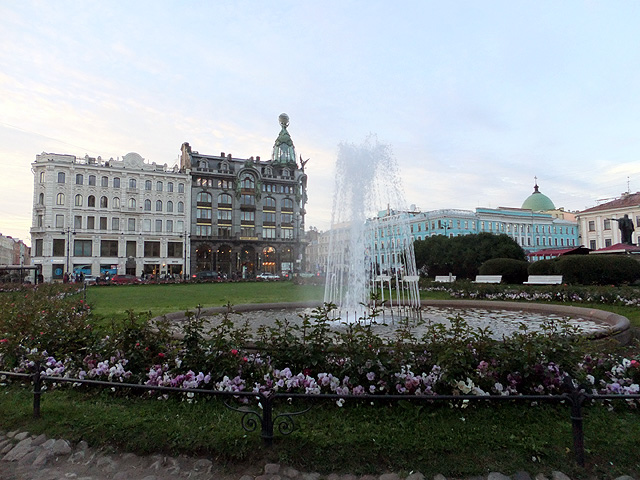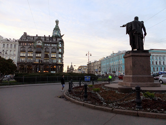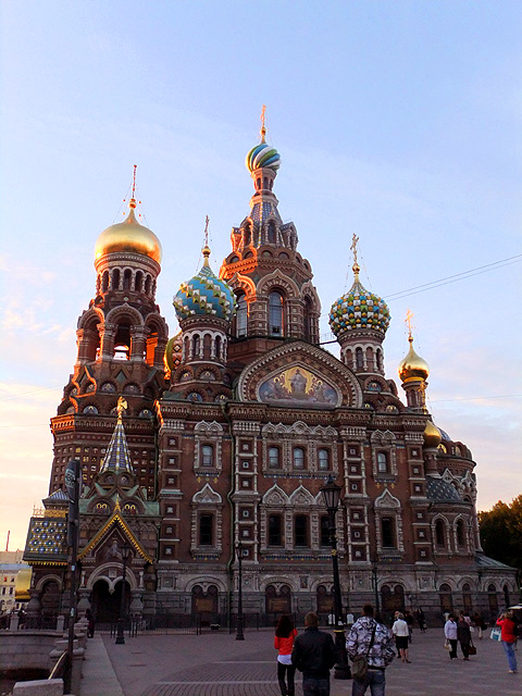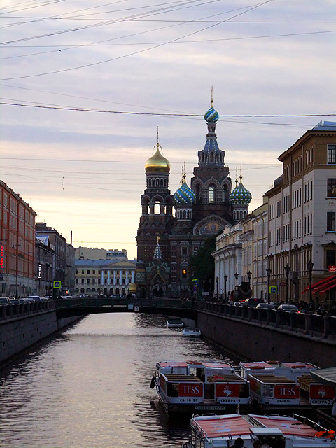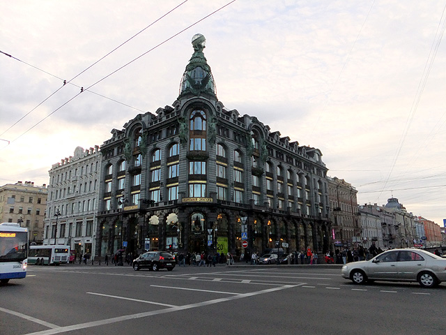 此棟「勝家大樓」(Singer Building)早年是這知名縫紉機品牌的俄羅斯分部,不過現已成了座書局,在幾近半夜的時分,仍以其敞開門扉招引遊客聚攏於內。我走了進去,想找些詳細介紹聖彼得堡教堂的書籍,但逛了一圈,翻了無數本,都是些設計給觀光客的淺薄書冊,幾張外觀照片,些許簡介文字,便跳至下個主題,最希望看到的教堂廳內模樣卻付之闕如,頗令人失望。