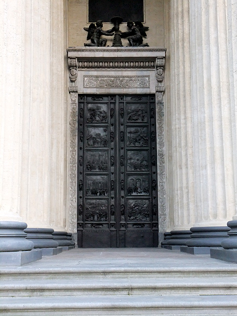 它的門面綴飾其實不算多,似以質樸莊重作主調,山形牆內也僅點出燦亮日芒。倒是置了先知立像的兩側龕室有添些妝點,在頂頭略為襯上浮刻,緊閉的厚實銅門亦切分出框格,精細地雕繪成生動故事。數年前曾行過義大利佛羅倫斯的「百花大教堂」,此處臨摹的便是那兒洗禮堂的「天堂之門」,當然不若原作的金燦,但在門框飾帶的團繞下,依舊顯得繁麗。
