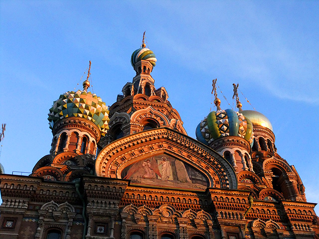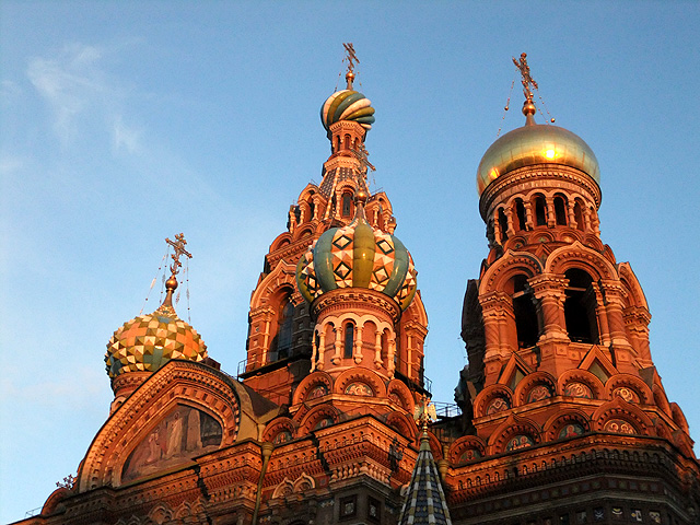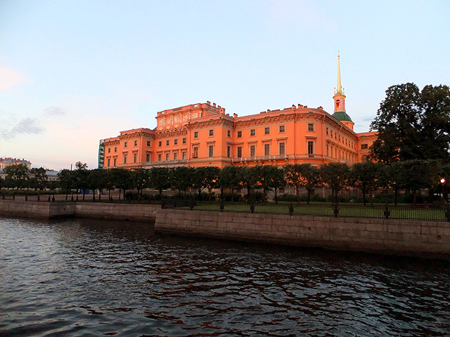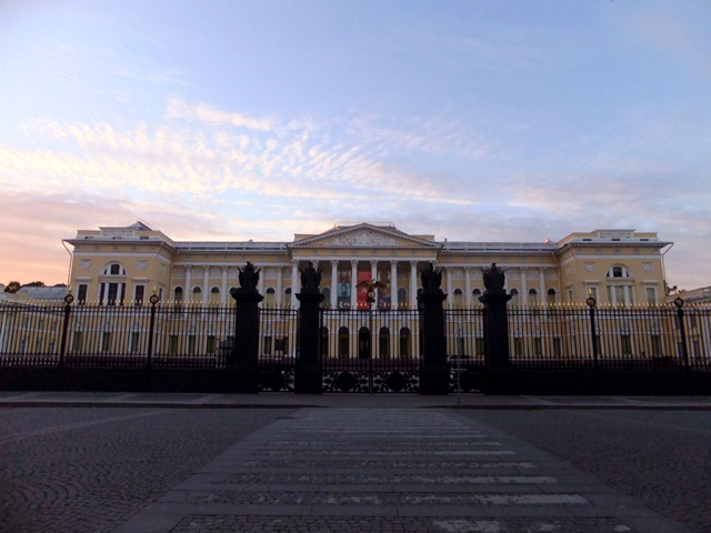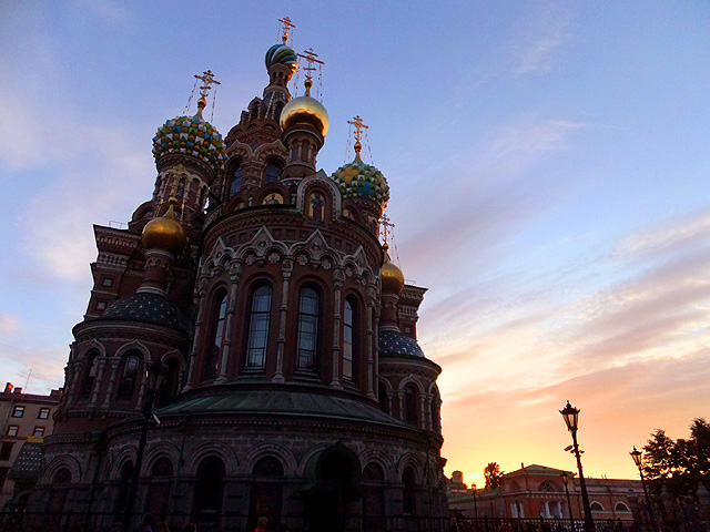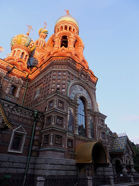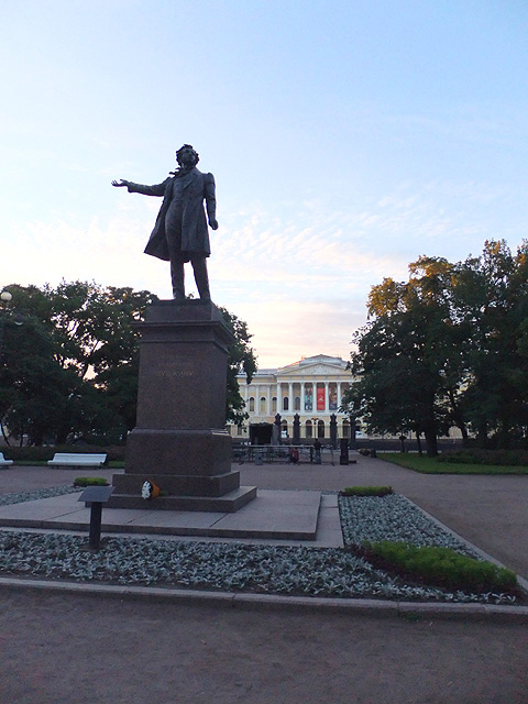 不遠處廣場裡,我又見到了普希金雕像,這回他並非支首苦思而是揚手問天,而林樹後是「俄羅斯博物館」,以山牆、拱窗、列柱橫展而開。我站在鐵籬外,還兀自探首研究其架構時,突然眼角瞥見左方天際被抹上霞照,那顏色似粉紅玫瑰,由淡淺一路疊染加深,至「滴血大教堂」旁成了盤繞不去的嬌豔。