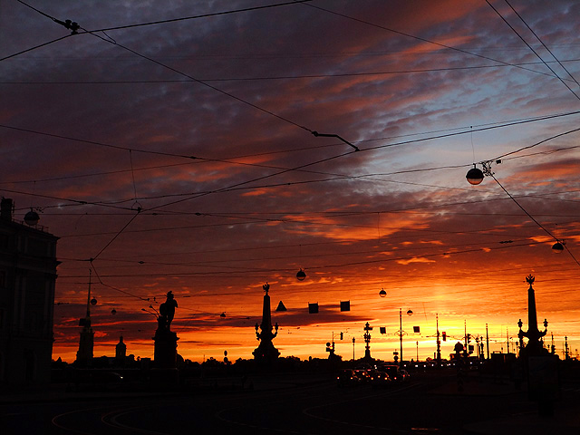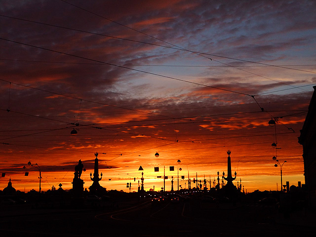 終於我還是讓了步,將他們棄於身後,往前走至靠涅瓦河的大街邊。此時,我見著了壯美景致,天邊雖已灰雲揉凝密佈,但夕陽卻索性以其當畫布,他豪爽地以焰舌灼吻,拿自我生命為引,燦烈奔燃而起。於是雲層彷彿飄繞騰空的烏煙,如鬼魅持著暗黑旗幟撲降而下,而日神飛髮定杖,驅動炫光綻射擊迎。