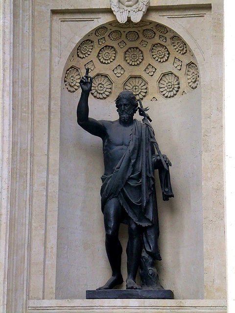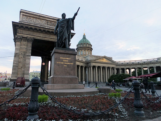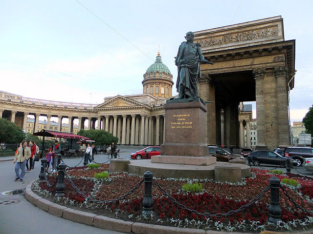 遠遠望去,圓形廣場有綻射噴泉的小花園,弧廊兩端各有一尊墨黑銅像,雖身穿戎裝,但似仿著古羅馬風格披垂巾袍。面對教堂的左手邊是領導俄法戰爭的「庫圖佐夫」(Mikhail Kutuzov),他延續著弧廊的外探氣勢,揚臂指向遠方。右手邊立姿較低調者,則為同時期的另一位元帥「巴克萊德托利」(Barclay de Tolly)。