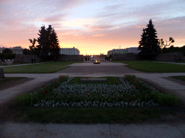 我怔愣定望,直至簷頂上那溫婉的色調逐漸暗寂,才繼續尋路前行。雖說前行是覓著地圖上的「戰神廣場」,但其實依舊是被天邊落陽勾著,追跡而去,等待它的幻化姿態。廣場寬闊,幾處修剪整齊的草坪,幾叢立樹,正中是祭悼戰死無名將士的不滅之炎。有兩個年輕人湊了過來,似乎想拿這火作些詭事,但見我於那定看焰火與晚霞爭著艷色,又瞧著我、竊竊私語。