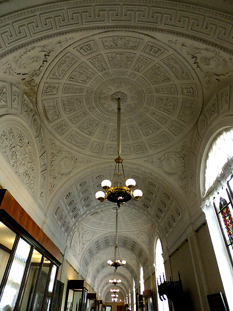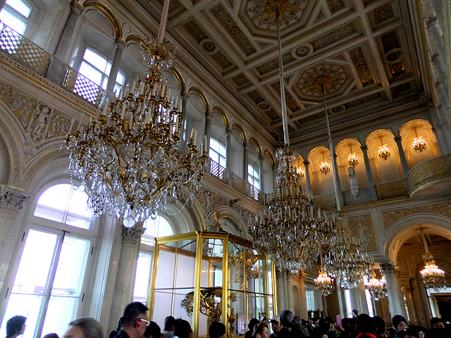 往前走會進入「徽章大廳」(Armorial Hall),但雖被這麼命名,仔細看上一圈,也不太能辨析徽章究竟在哪兒。事後查了資料才知廳旁戰士雕像的矛棍標著各省省徽。不過此刻被用作展覽舊時服裝的這個廳室,金漆繪亮成對排柱、閣樓環展扶欄,顯得奢豪,搭配上輝澤吊燈更有種皇威霸氣。