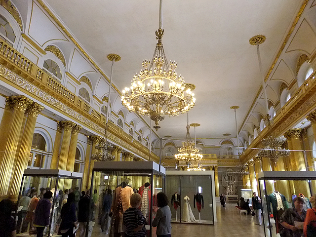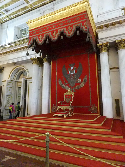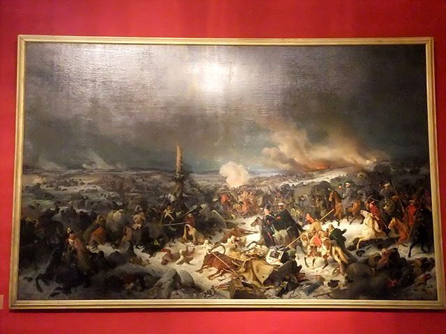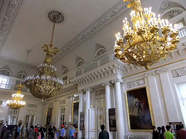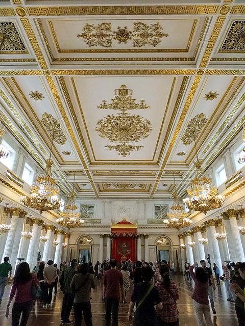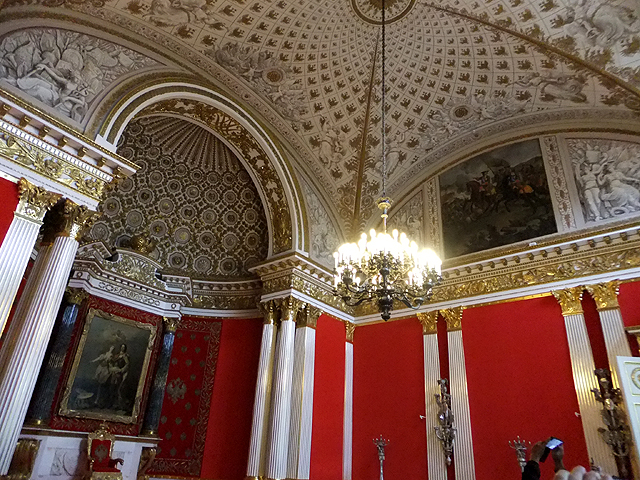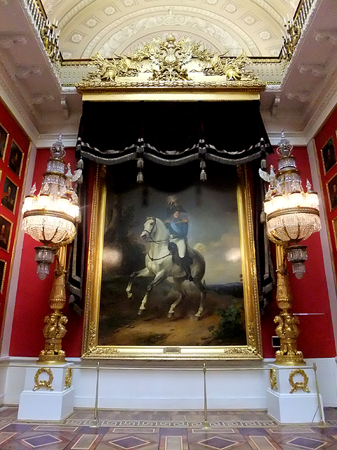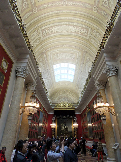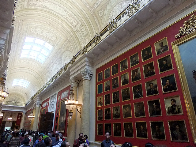 轉個彎出了此廳側門,是狹長橫展的「戰爭長廊」(War Gallery)。用明暗筆觸繪出浮刻的拱頂下,壁面暗沉血紅,其上整齊掛置以「亞歷山大一世」領首之332幅將領畫像,紀念他們1812年與拿破崙對戰的犧牲奉獻。畫家繪出這些軍官的氣宇軒昂,不論年輕狂狷抑或老成沉著。其中空缺的,表示捐軀於戰場,只能以名諱留存後世。但當我望著,卻覺得無奈,畢竟最值得緬懷祭奠的,該是那些於前線以肉軀拼殺的無名兵士。