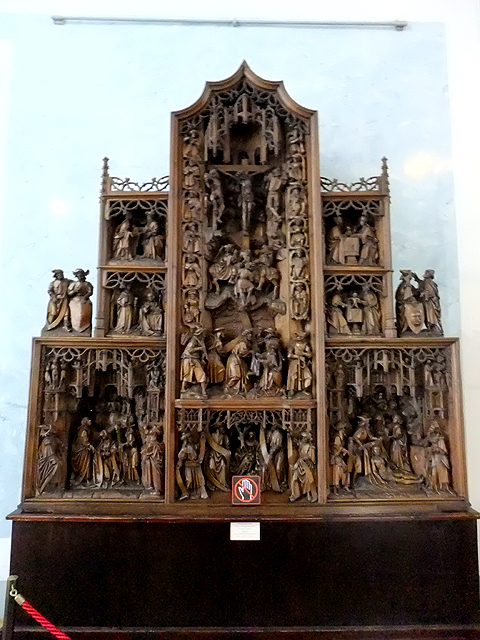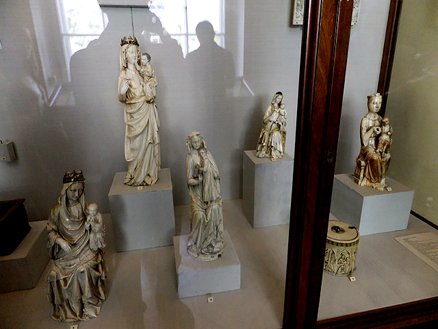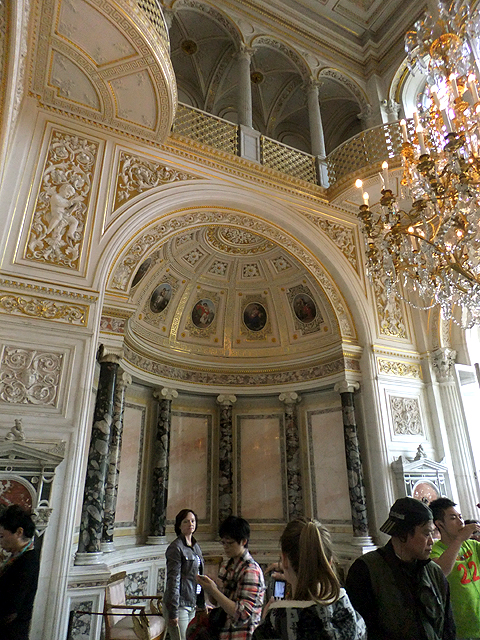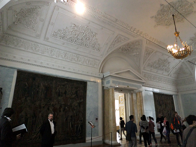 而從「大金鑾廳」往內走,便進入「小隱士廬」區域。這座長帶建築原本是「凱薩琳大帝」建來休憩之處,南北分設亭閣,中間築起枝葉扶疏的空中花園。我們先遇上的是接聯兩閣的外環長廊,目前被用作「中世紀裝飾藝術廳」,能見到壁毯、聖壇祭龕、供於教堂的聖母子雕像。不過對我而言,引人的是頭頂拱弧的刻鑿,方圓之間的聚散便自然拼出一種趣致,綴連邊角襯葉就是種瑰麗。