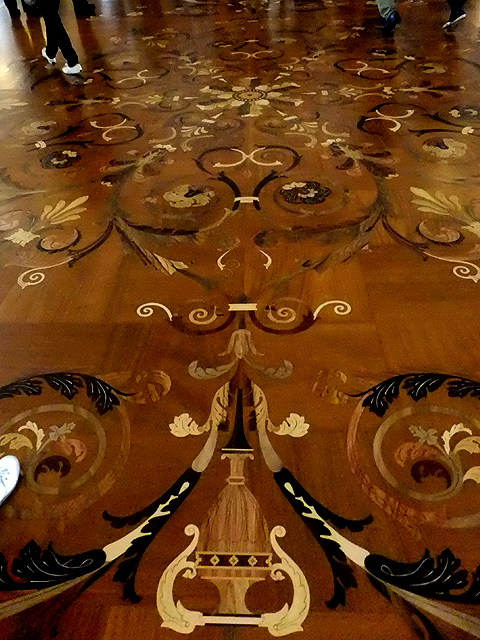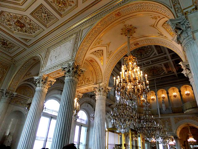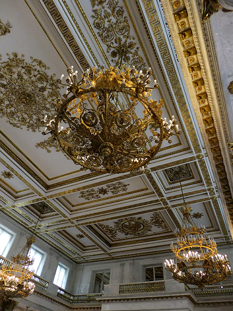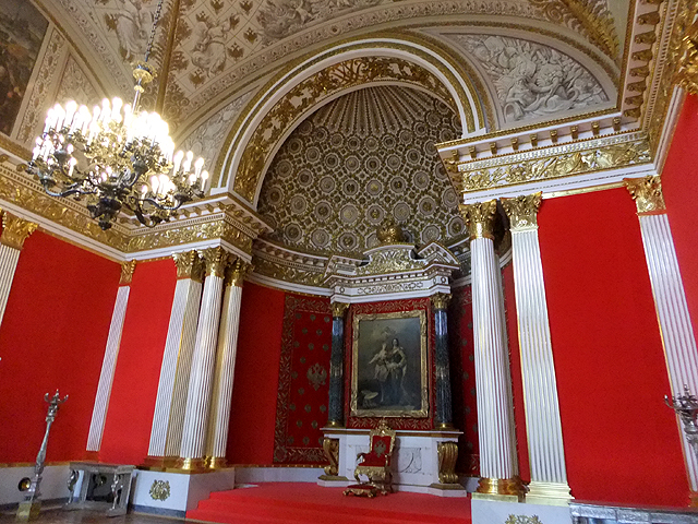 再過去,便為冬宮最主要的「大金鑾廳」(Large Throne Hall)。適才「小金鑾廳」以細微密飾讓不大空間顯得精緻,這兒則以開闊氣勢呈現嚴謹隆重。淨白為主的色調透著神聖,點上些許金燦的柱頭短欄耀著貴氣,對牆紅艷的幔頂華蓋下則置放了王座。由於華蓋之上尚有聖喬治之浮雕,故此廳也稱作「聖喬治廳」(St. George Hall)。不過最主要的華妝反而在天頂,捨去常見的斑斕彩繪,改以大塊框格作切分,其內綴上團密如花綻的耀金圖騰。極易被忽略的地板也有巧思,與天花板相互呼應的切分框格裡,不同材質的木條細膩拼組,深深淺淺地勾出繁麗花藤。