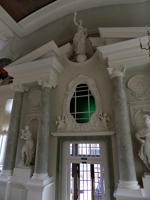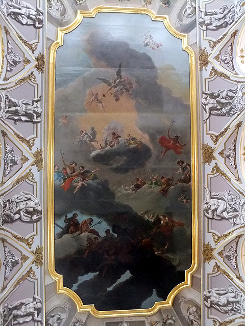 然當推門而進,挑高大廳內卻讓人忍不住抬首佇望,壁面雖依舊淡素,僅抹了些粉色、挑了些勾邊,但感覺是將光芒作給簷頂彩繪。天篷主畫的柔雲淺嫩,承繼廳內色調,其間有與天鵝嘻玩的少女們,豐潤身姿、秀美面目,漫著早春生機蓬勃氣息。周邊一個個弧框裡是暗底小圖團繞烘托,不太能辨析故事內容,但當中人物針鋒相對、衣袂翻飛,似有著衝擊劇情。