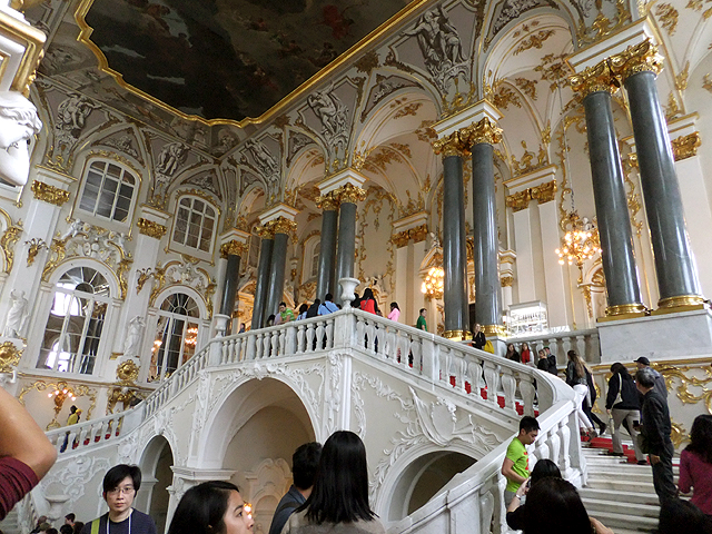 然導遊沒帶我們由此處大門步進,反沿外牆繞至河岸,自另端探訪。從門廳左轉行至角落,這兒有富麗堂皇的「約旦階梯」(Jordan Staircase)接迎遊客登入寶殿。其名自有典故,因耶穌於約旦河受洗,而沙皇也由此梯參加涅瓦河受洗節之慶典,故便這麼命名。