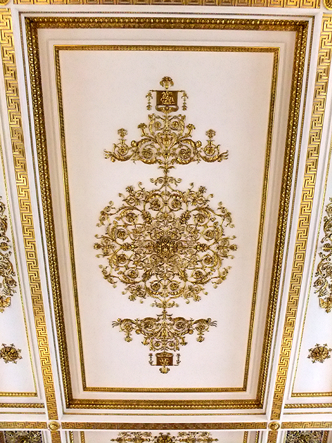隔壁是紀念「彼得大帝」的「小金鑾廳」(Memorial Room of Peter the Great),以飾帶勾邊的焰色壁龕內有綴金鑲紅之寶座,背牆掛置「彼得大帝」與雅典娜相偕的虛擬繪像,神化其身份。不過揪緊視線的是繁麗拱頂,用灰階立體手法描繪的浮凸人物框邊之上,交錯弧線切出細碎格紋,金色徽記在其間往內漸縮為斑影。龕頂處則另以圈點交互拼組,形成異曲同工之炫惑。