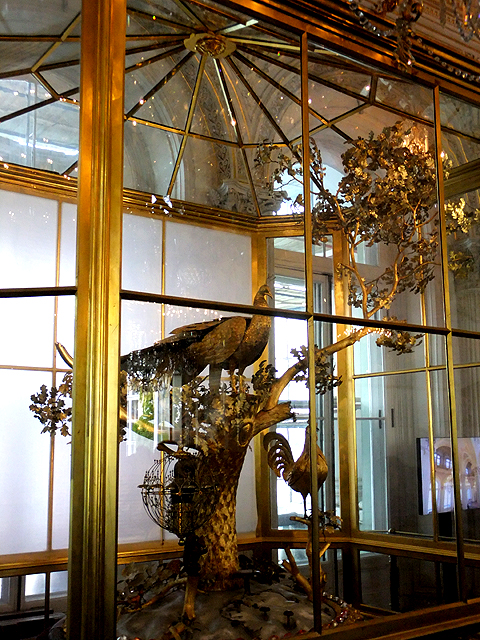 儘管廳內弧拱間的設計撩人,聚集遊客目光的卻為邊側大型展櫃內之物事。乍看似座黃金打造的絢麗裝置藝術,有羽翼細膩雕鑿的昂揚孔雀傲立枝葉間,但其實為經巧思設計的機械鐘。由於過於珍貴,目前可能僅國賓有機緣見其報時表演,我們遊客只能藉一旁影片窺其精妙。
