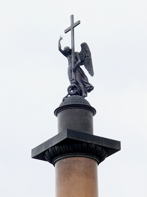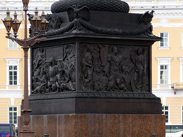 寬闊廣場被博物館與另側弧形建物包夾,舊時參謀總部、外交部與財政部分設於左右兩翼,再以巨形凱旋門串接,頂梢尚有古戰車駐守,遠望過去氣勢萬鈞。但最醒目的還是場心的「亞歷山大紀念柱」,它記印「亞歷山大一世」成功抵禦拿破崙入侵,底座浮刻以甲盔盾牌呼應戰爭,柱頂則有天使乘風臨降,他揚臂持擎十字架,似正哀悼那些殞命亡魂。