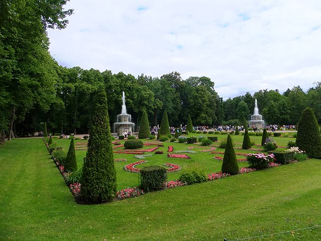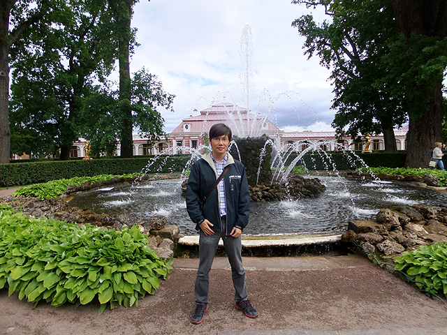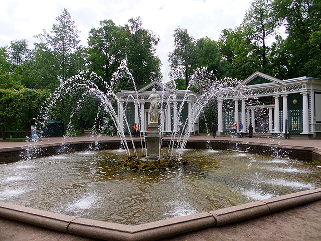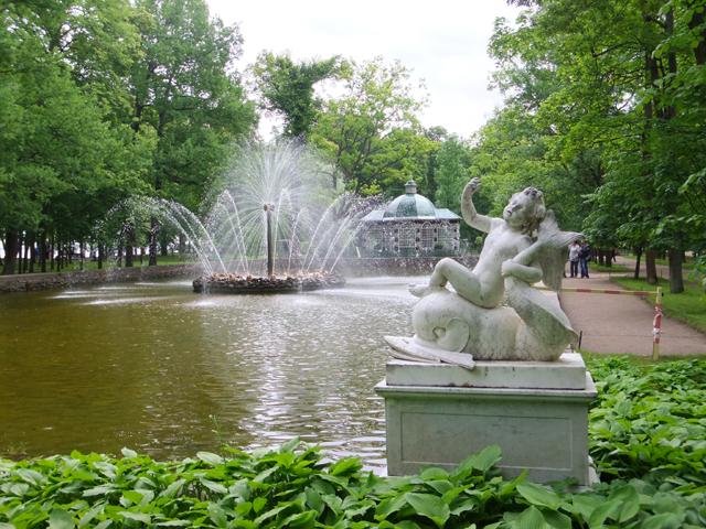 「下花園」以宮殿為中心,有兩條斜向步道,道中也對稱置了「亞當噴泉」與「夏娃噴泉」,象徵「彼得大帝」與妻子的結縭。我遇到的是前者,泉旁以墨綠網格裝飾的白皙山簷亭閣抱擁,而立於環繞水線間的亞當裸身撫胸望向遠方,不知在感歎著什麼,或許是懷念過往那段無憂時光吧。