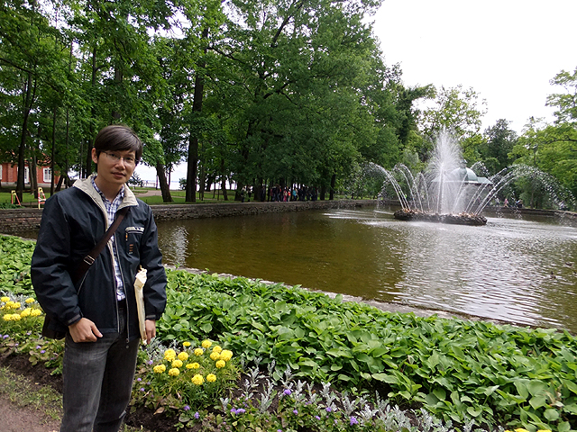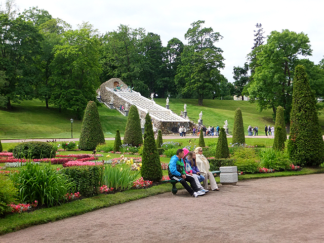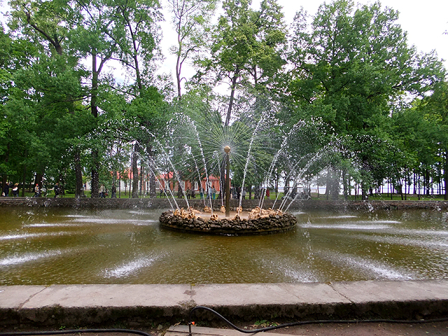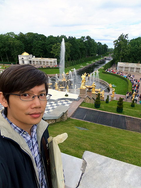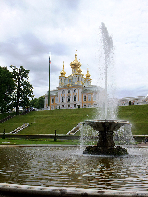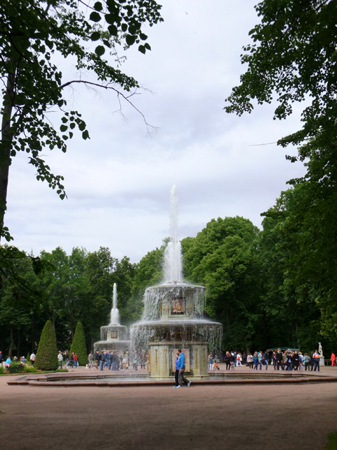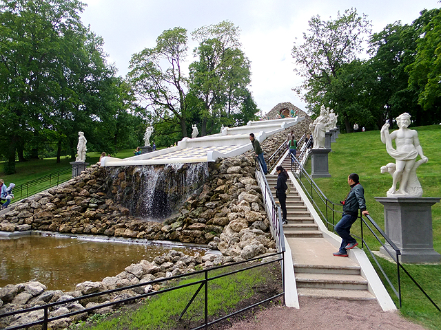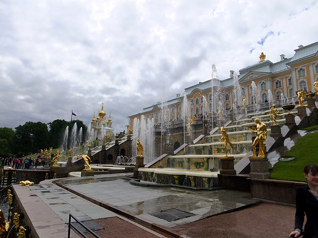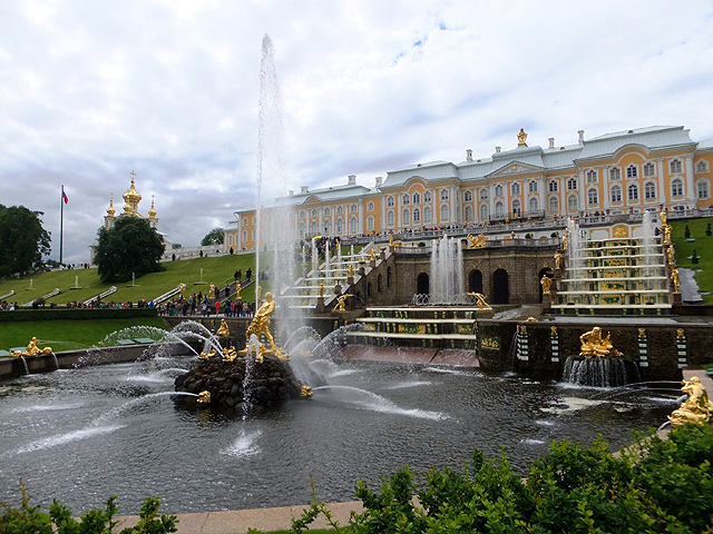 立於階底圓池的,是位於噴泉核心的參孫雕像,礁岩上他賁鼓肌肉扳開獅子利口展現武勇,象徵北方戰爭俄羅斯擊敗瑞典,高達二十公尺的主泉自獅口彈躍衝天而後奔灑成雨,四周的海怪群也環散著泉弧,如苞葉開綻。我在這兒往上端望,主泉背後設計成大小巖穴疊砌,內裡佈置石雕,穴口輪狀泉線交錯若花籃。而兩旁被雕像水泉妝點的層降梯面亦刻上炫亮橫幅故事,丘頂殿閣被如此靈動的水光幻景烘托,更顯氣度非凡。