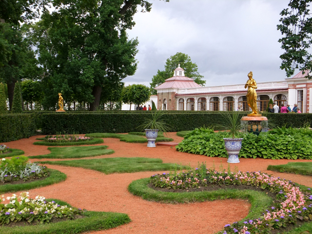 「彼得夏宮」的宮殿巡禮出口在面對「下花園」這側,而當我們於殿內逛繞一遭,推開門扉,本呈靜寂的泉池已換上抖擻面貌,精神迸發。丘下花圃對稱開展,各自有綴著金頂的小敞廊與綻著狂放水柱的眼泉。而在這居高地勢,運河從腳下筆直一路往外,於成列圓泉的護擁下,劃穿密林至灣口,成了一抹快意風景。