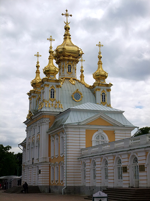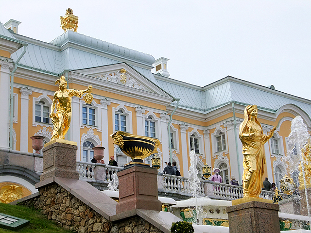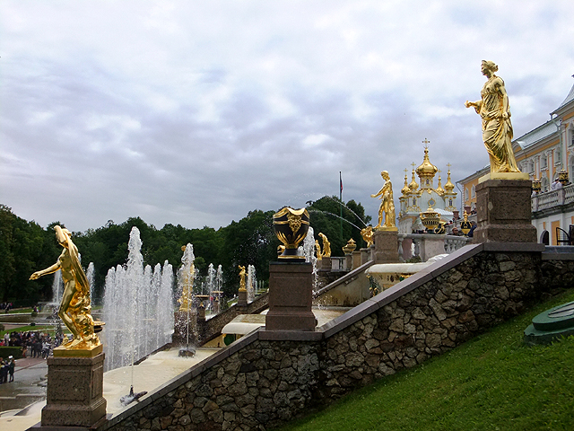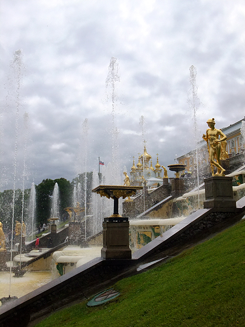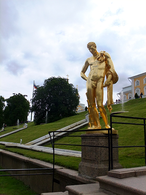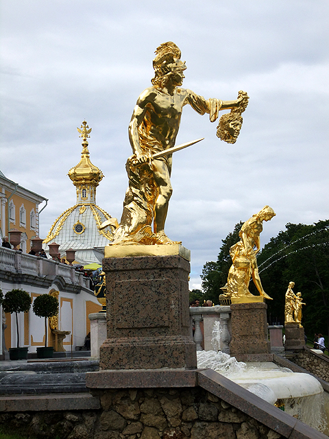 引起隊眾頓時嘩然的自是「大階梯噴泉」,這座有七十多個泉眼、兩百餘座雕塑的恢弘作品由「彼得大帝」親自設計,紀念北方戰爭的勝利。我由旁側步階緩緩下行,身邊羅列的燦金雕像來自神話故事,宙斯、維納斯這些神祇依序佇立,而拎著梅杜莎頭顱的波修斯、戴著翼盔的信使墨丘里,是其中形樣鮮明角色。他們錯落著,與間歇綻射的水線相應和,當連結上背景教堂的叢聚帽冠,便有耀目風姿。