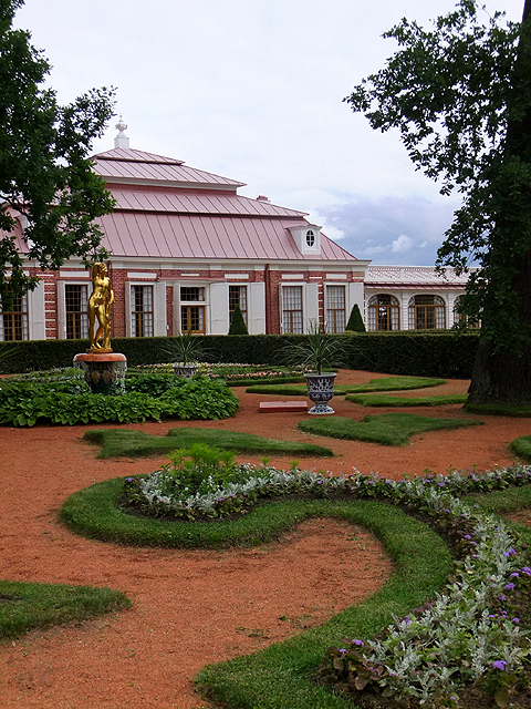 由這兒沿丘底往主宮走,半途尚設了座「橘園噴泉」,資料說附近有柑橘之類的果樹,但用我這無知雙眼自然沒法分辨。也有另一稱是「溫室花園」,以旁邊那粉面白柱的溫室為名。可是老實說當時僅覺這樓閣鑲著成列拱窗,頂簷綴有露天步廊,整體佈局雅致,倒也窺不出可與溫室連結之意象。視線反而不由自主落於被其擁繞的泉池,畢竟粗獷魚尾海神撕扯海獸大嘴,獸嘴噴吐奔天水柱,怎樣都是種帶起澎湃情緒的演出。