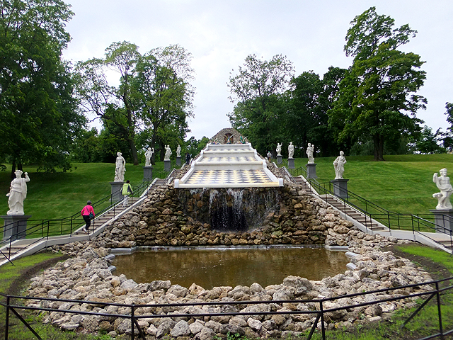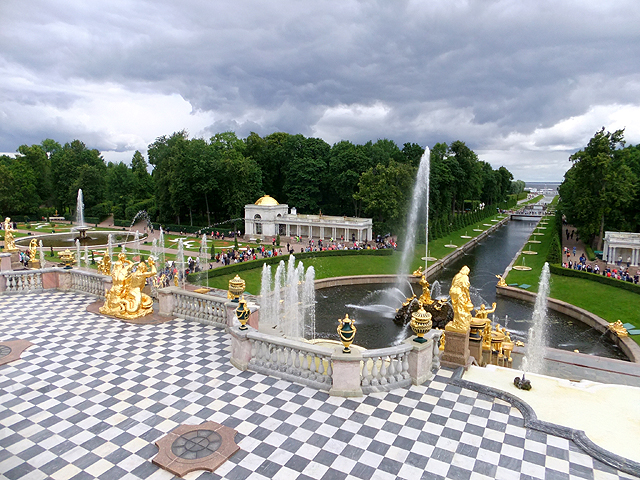 水池周遭有紅艷勾旋花圃,中軸偏南處為「棋盤瀑布」,它自宮殿高地斜緩落展,鋪滿黑白相間方磚,最頂是三條振翼龍怪,水泉便這麼由龍口噴吐,而後漸次從坡面斷層跌降。順著一旁階梯攀上,扶手邊有雪白成列雕像,當一回首,我也望見了他們定步怔視的開闊景致。