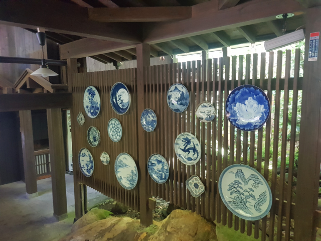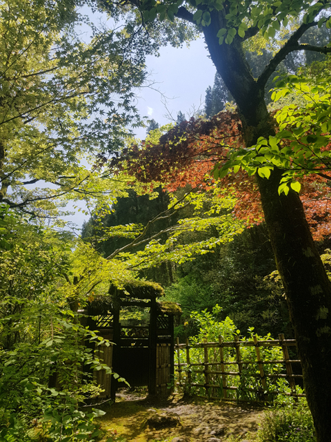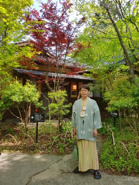 第一間離「いやしの里 樹やしき」不遠,於是旅館提供的浴衣就派上用場,它有三種底色,很直覺地,粉紅被優先排除,然後旅伴搶走藍色,留了土黃給我。套上隨附的小外袍,我們晃過獨立屋所在的庭院,相比夜裡呈現的幽魅,晨光照撫的感覺又不同,茂林簇擁的小屋像個隱逸居士,無憂無爭,葉爍是其無聲的問早。