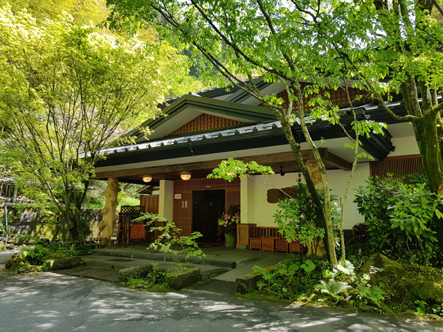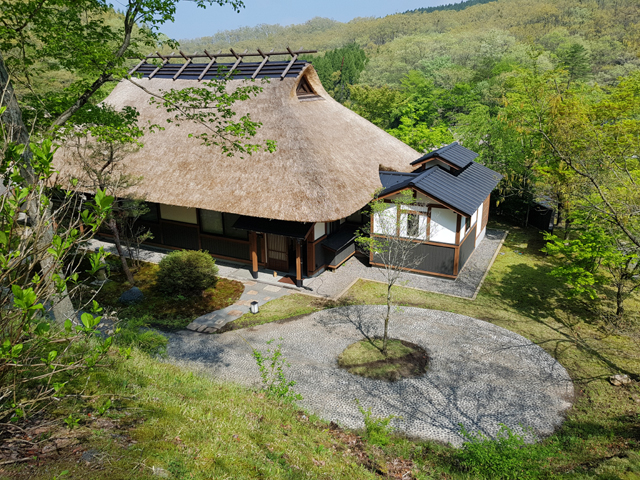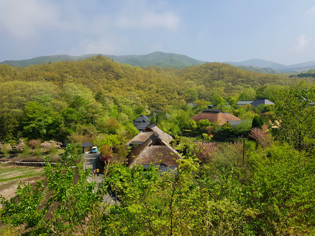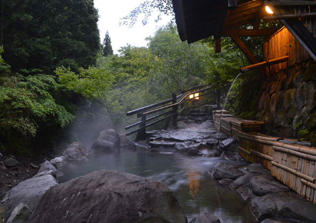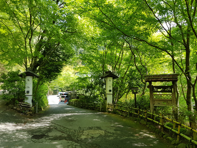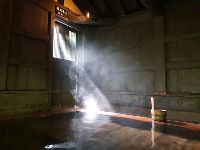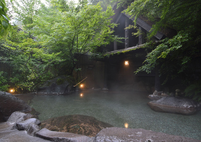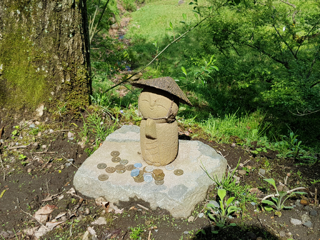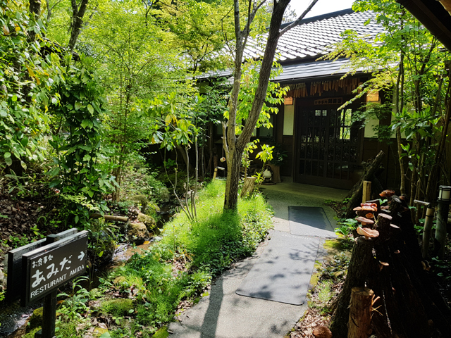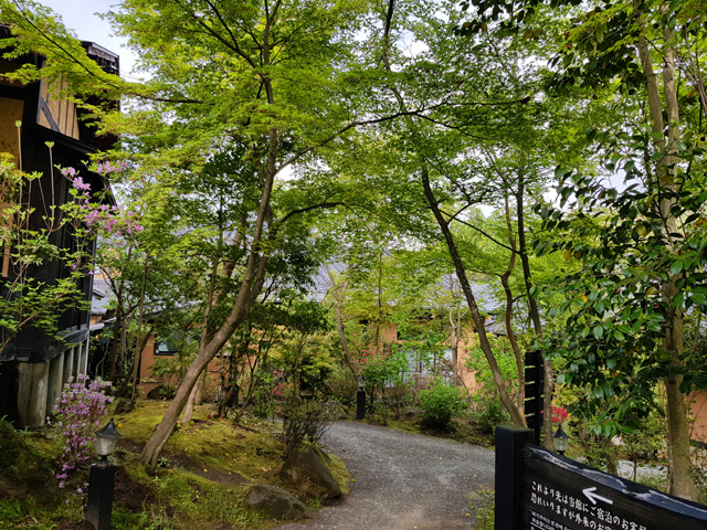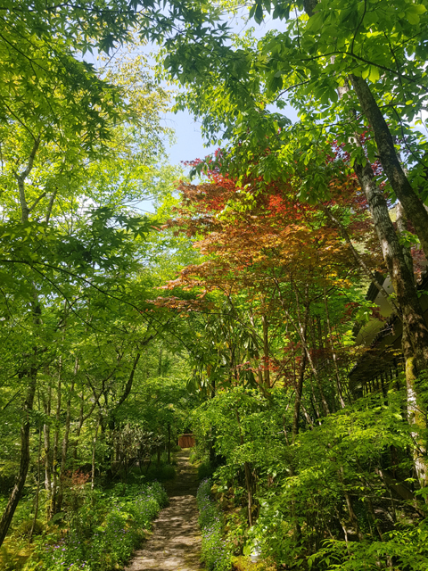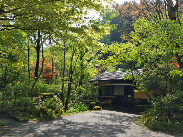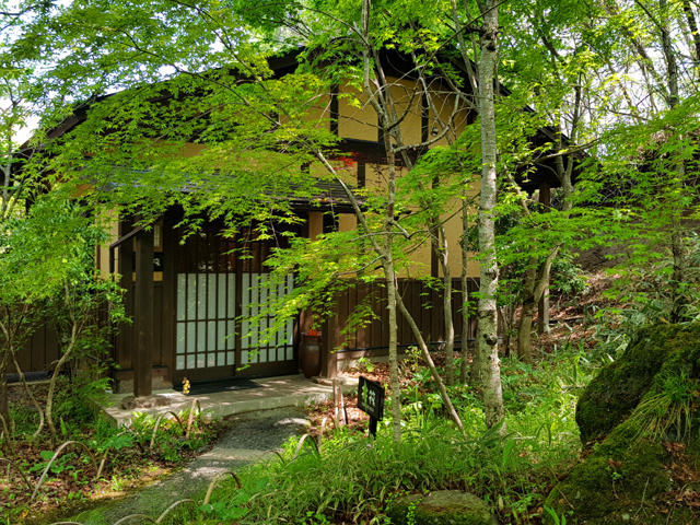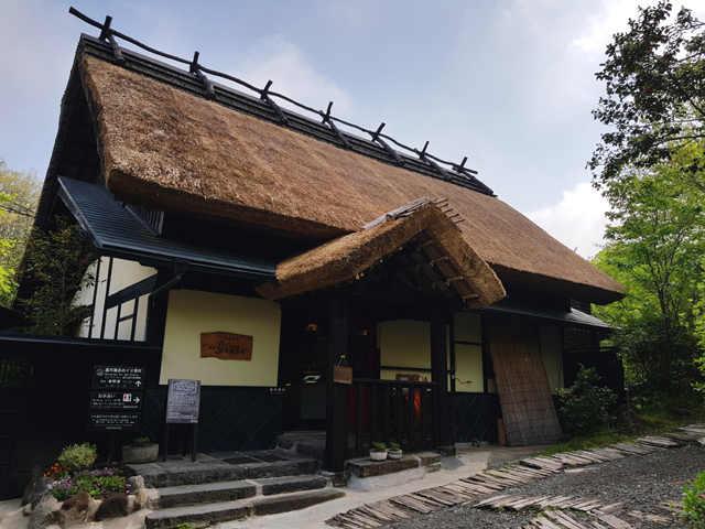 經過在路邊戴著斗笠的微笑小地藏,望見的「山水木」也跟民家一般,有著樸拙草簷,把手形給櫃檯蓋過章後,我踏上通往風呂的小徑,男生可用的「幽谷之湯」比較近,再續走是女生的地盤,有室內的「風人之湯」與戶外的「森之湯」。