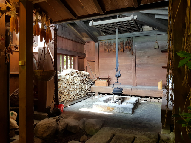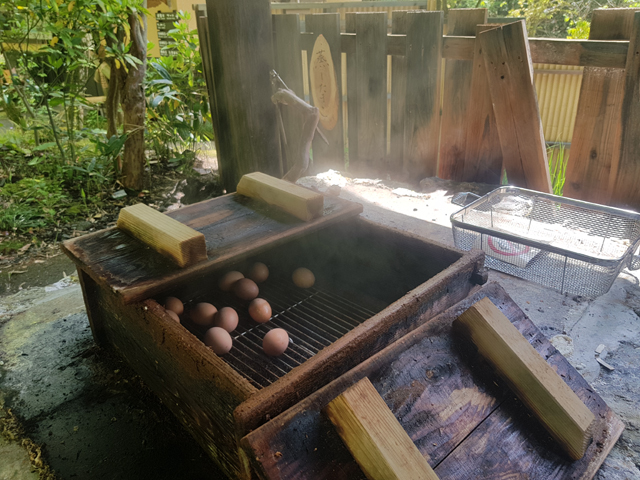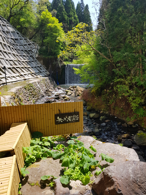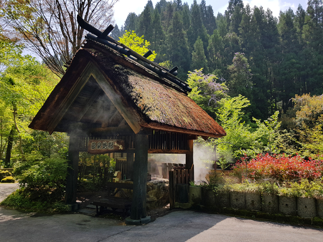 手形的最末一站,我選的是「奧之湯」,由於地點靠近鎮心,結束在「山水木」的享受後,便決定先回旅館check out,把車開出。哪知當駛了過去,卻發現無處可停,工作人員比劃著要我們離開,似乎周邊腹地只提供給住宿客。於是便花了好長的時間在鎮區轉繞才找到地方,想當然走回「奧之湯」又是大段腳程。即使覺得煩累,館外的造景仍讓情緒振奮,它設了一棟開敞小茅屋,標著「地獄溫泉」,簷下石井冒著白煙,可能早餐沒把旅伴餵飽,後來他還投了錢,買了井網上的溫泉蛋。