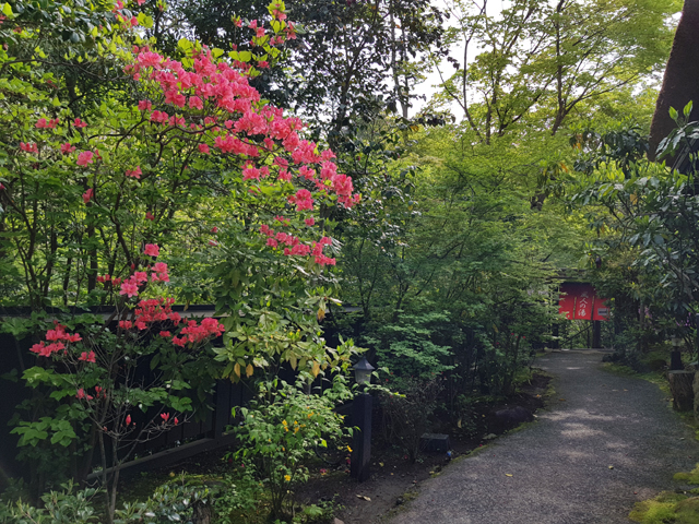 據圖板所示,「地獄溫泉」右邊為新館,內含餐廳和貸切池,妙的是居然還有岩盤浴、溫泉游泳池跟按摩服務,再過去則為以連串小木屋組成的別館,而我們能使用的大浴場在左邊本館。蓋過了手形,望見的大廳朝洋式靠攏,家具裝潢雖漾著老式氛圍,卻能感覺出擺設上的嚴謹心思。外頭步道也相當引人,綠樹擁迎間,有幾株已迫不及待早轉金橙,在陽光透映下泛著笑意,就算是簡樸的籬門,都被勾勒得像離塵虛境。