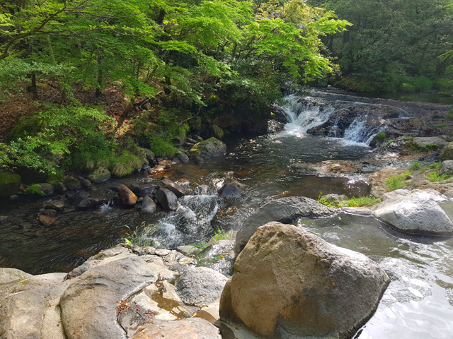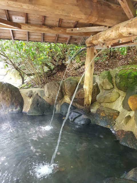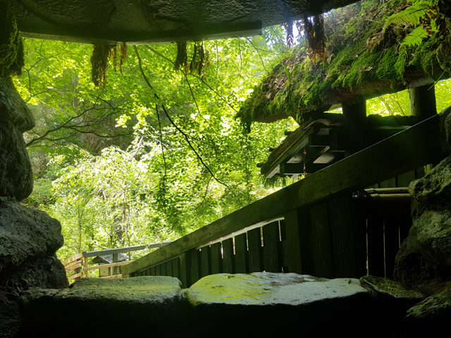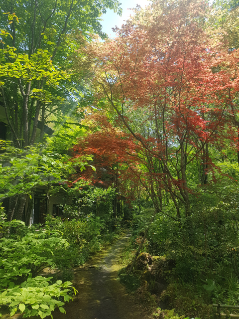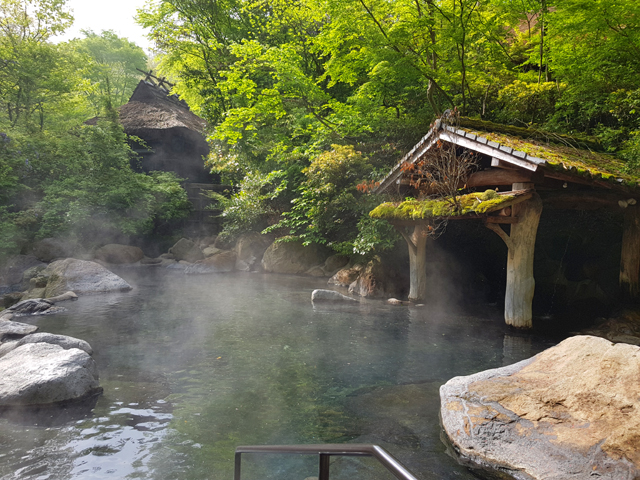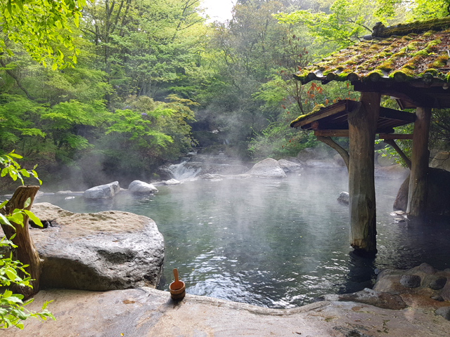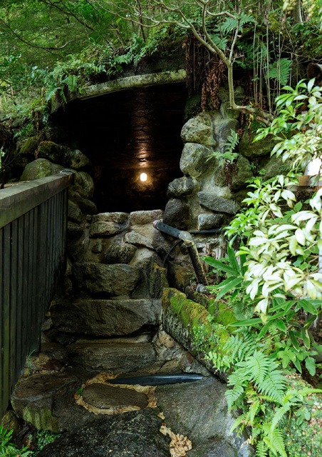 泉質水溫令週身舒暢,翠碧的林色也讓心情輕揚,不過既已從清早一路泡湯至此,便很難安於發呆放空,想尋找更多新奇。據官網所述,手形可使用的區域不止於此,起身外探,果然有個標牌指向「洞窟風呂」。好奇隨徑走入不遠的岩洞,裏頭蒸煙迷茫,頗有探秘的氛圍,可惜這種在未知摸索等待開獎的曖昧想像,很快就被戳破了,是有個由石間鑿出的熱泉,規模卻不大,若是無人,或許會覺其外觀別緻,想在裏頭好好感受一下,然現刻它被不斷佔據,勉強踏進大眼對小眼,很快就覺得尷尬溜出來了。