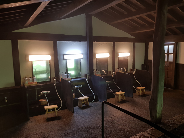 當初也曾猶豫過是否訂這家,畢竟溪邊風呂相當引人,況且又說同老闆的三家旅館溫泉都可免費體驗,但與「いやしの里 樹やしき」來回比較,衡量著以我們的一晚造訪,要排入三家來使用手形都很拚,再多的可能都沒時間去。而住「山水木」雖應可多使用到女湯部分,由官網照片來看,格局似乎與男湯頗像,「いやしの里 樹やしき」則有較多變化,旅館環境也藏了不少別出心裁。