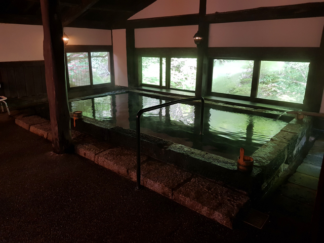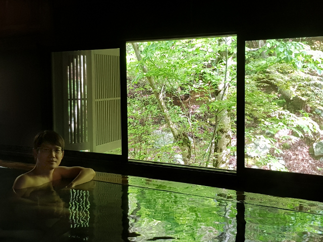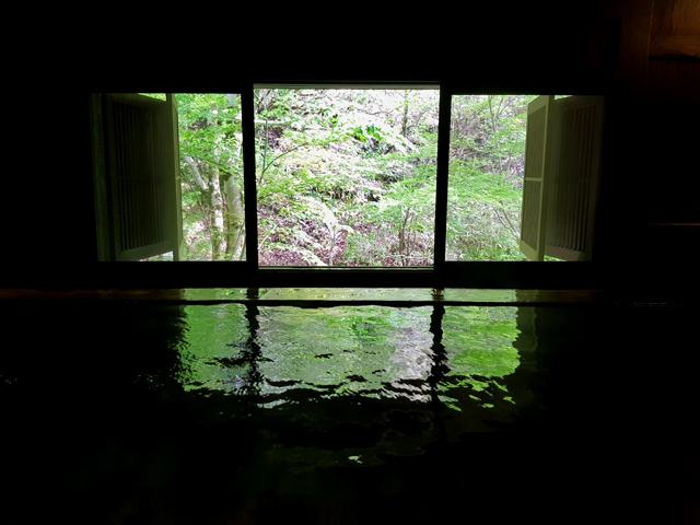 「山水木」除了提供溪景的「幽谷之湯」,男生區尚有兩個內湯可用,在盥洗處的較為普通,另個便別緻許多。當穿進隔鄰的小木屋,窗光篩出的水煙裊裊先添了一抹慵懶,再往旁望,沒有玻璃霧擾的敞窗引入了滿滿林色,連池面都映染得碧綠。這場景超適合拍寫真,連我們也不免假掰起來,埋身水裡,倚欄眺望。不過怔望了一陣,最後還是離開小屋,回歸外湯,可能人不管再怎麼社會化,靈魂仍舊記印著遠古時的無拘無束吧,嚮往拋棄因禮教而生的遮掩,大自然就是身體的延伸,因此當熱水蒸煙浸潤著,眼前清流奔馳著,心情也隨之翱翔。