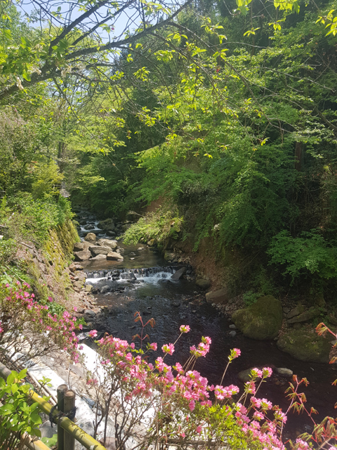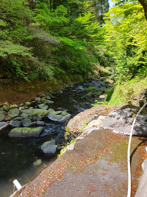 雖然挺好奇那方向的造景佈局,怕被通緝的我瞄了兩眼,便乖乖轉入男生區,踏進的第一件事自然先各處掃描,可能是來得早,大多住客仍在賴床,無人的空景讓我瞬間狂喜,趕緊祭出手機瞄準主打的「幽谷之湯」。其岸邊搭了斜簷敞亭,隱著落墜水線,稍高處另有棟茅葺小屋,與茂林相攜枯榮,漾著幽趣。而當視線越過另側砌石,一如在官網所見,是貨真價實的小溪,沒有樹叢阻攔,更無籬牆礙眼,只要倚於池緣,身旁便是川水隨地勢撲跌、匯聚,在相互衝擊後奔流遠去。