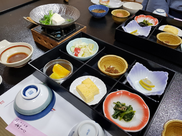 唇槍舌劍之後,我們繼續在「華之湯」耗著,待肚子竄出些許餓感,才去餐廳報到。旅館在早餐方面仍舊相當用心,雖無大魚大肉,主角似乎便是湯豆腐小火鍋,擺了滿桌的沙拉、配菜、水果,視覺上還是挺豐盛。快速填了肚子,我們沒在餐廳多作逗留,畢竟「入湯手形」還有兩家額度待花。