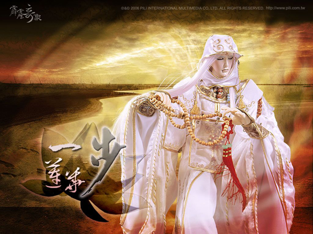 旁邊坐著的是「一步蓮華」,閉著眼、披著兜帽、手持大串念珠,