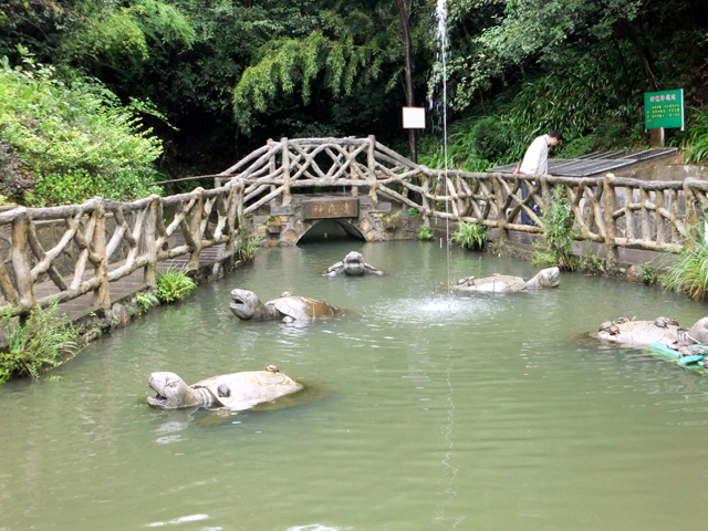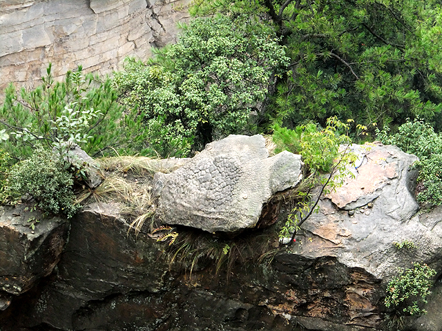 幾度回盼,我才送離它的身影,續往前行。途間有個「神龜池」,五個假石龜在池裡張口望探,稱是為應和此處相關之景。我在崖邊搜尋,花了一番功夫,竊聽旁人對話,才找到「神龜望天」。那是下方岩台上的一塊小石,有著外擴甲身與突出頭首,攀著枝草無依望天。若哪個頑皮份子將龜兒棄置於此,恐也是如此的徬徨之貌吧。奇的是殼身斑駁成顆粒化石狀,也難怪被與龜甲作連結,會否真為億萬年前哪個奇獸遺身就不得而知了。