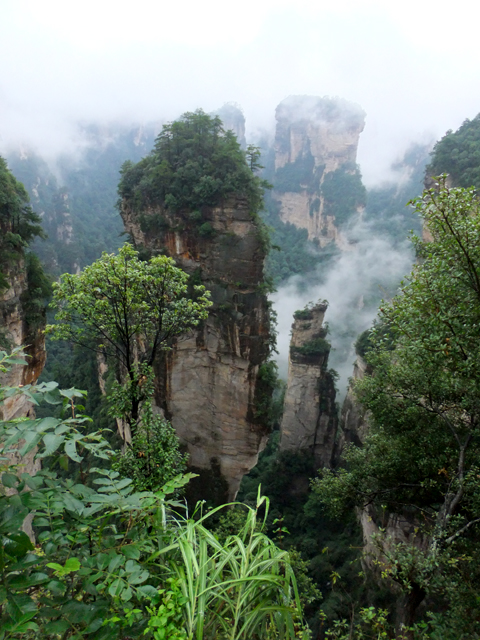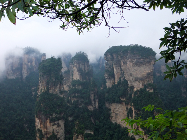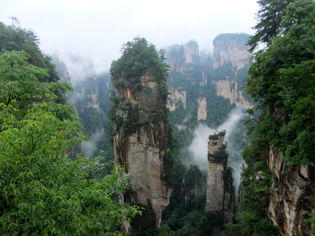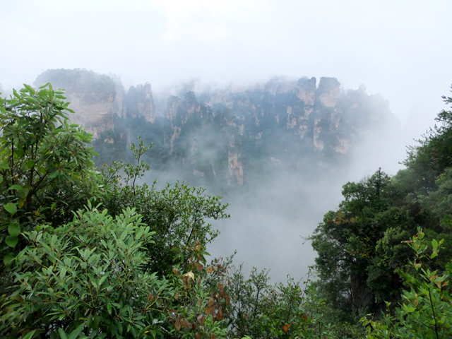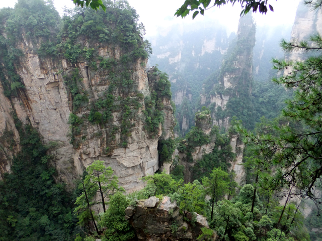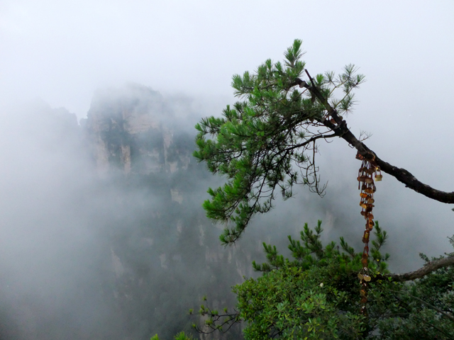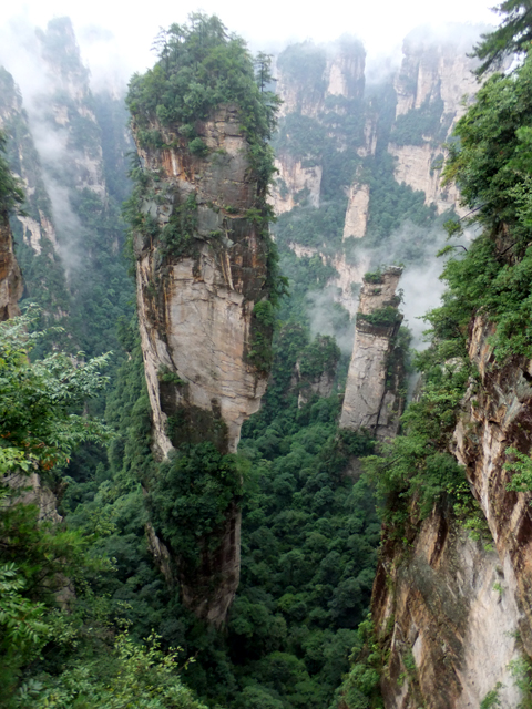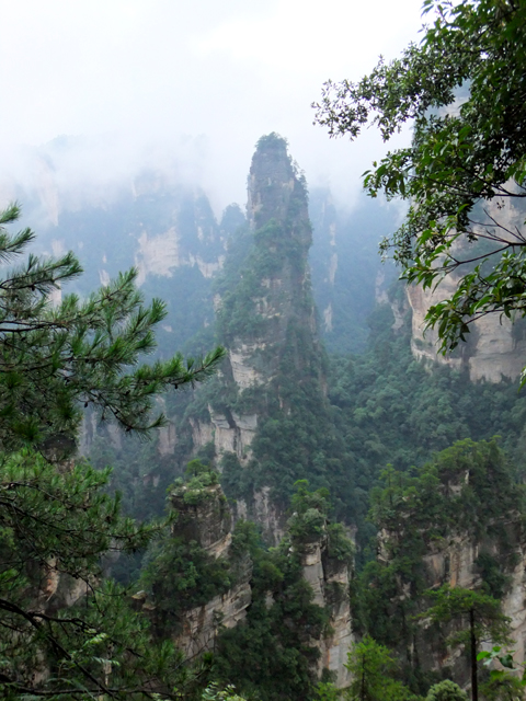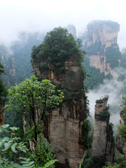 再往前,當看到「阿凡達」中的奇鳥雕像展翼,便見「乾坤柱」於其後谷地出塵屹立。它拔地支天,身軀乍看纖瘦柔弱,卻以沉穩力度迎抗風霜侵殘。頂冠相對而言顯得豐碩,有枝叢密綴,當石身被樹景遮掩,甚或機緣湊巧遇上霧海茫茫,便成飛空孤島,帶著翠頂峰巒,披垂藤葉,飄漫浮游。