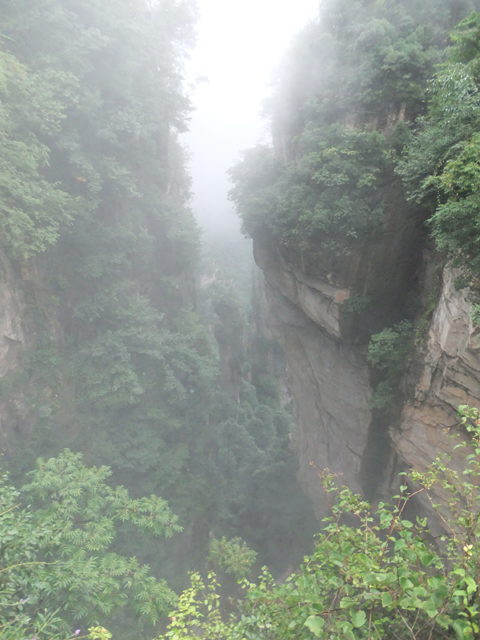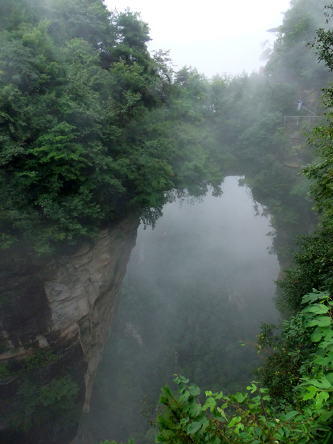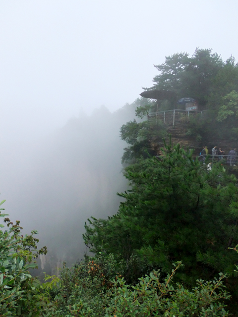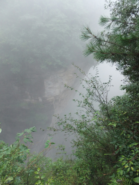 兀自研究時,附近導遊突嚷著:「起大霧了!」並要我們快步推進,免得看不到之後景點。聞此我也顧不得老父老母了,一溜煙便飛速往前衝去。果然,隨路彎拐,我見到遠方雲霧蒸蒸騰騰襲來,侵向掛在崖外的「天下第一橋」。這橋非人工所築,是山岩大幅塌落僅餘頂部顫巍巍撐著,便似石橋串連危崖與旁側孤立柱岩。