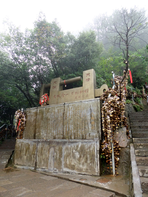 過了橋,岩頂有步道上攀迴繞,入口台座鑄了座龐大金鎖,以「天鎖」之名應和「天橋」,於是便見延伸圍欄掛滿鎖頭,稠密程度如豐產過剩的纍纍果實,誇張綴連而前。