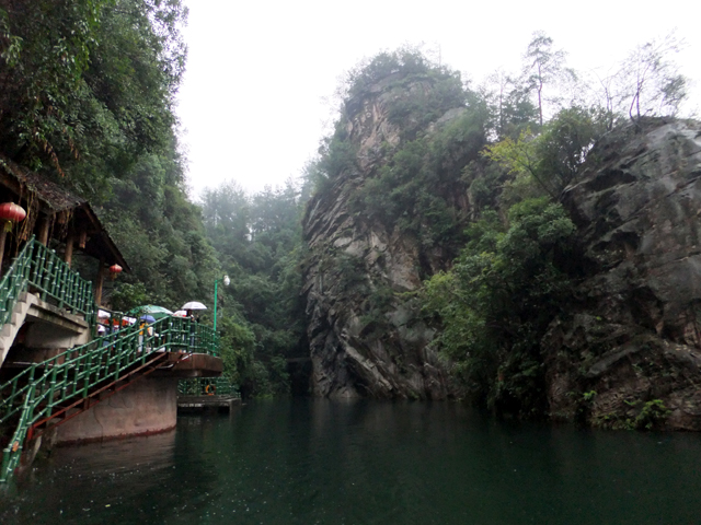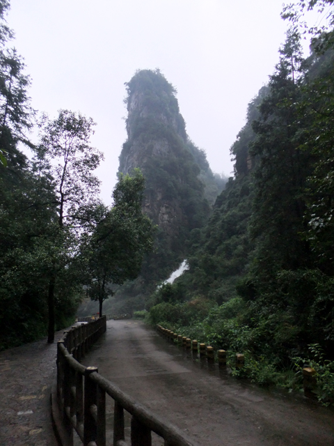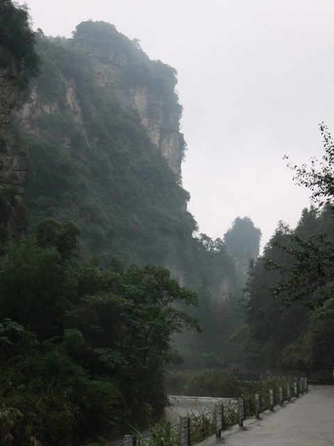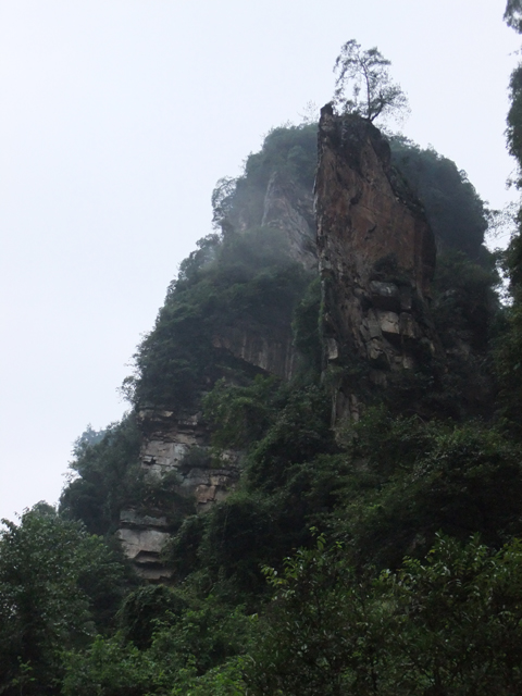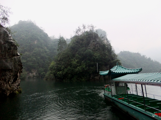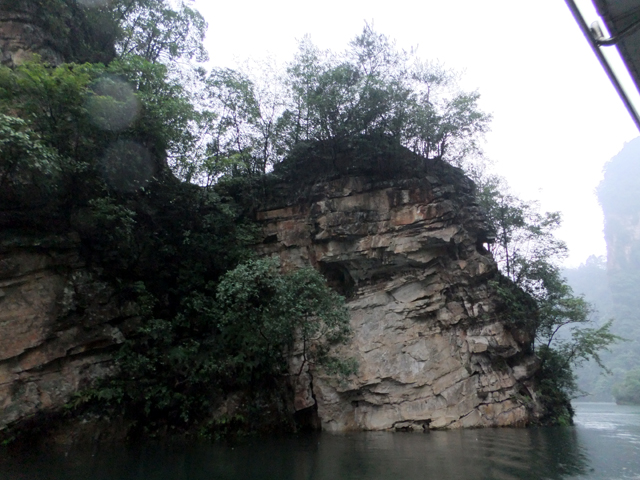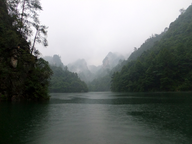 儘管此湖規劃於「索溪峪」,順理成章應在「武陵源」之範圍,然或因其地理位置,倒無需從「武陵源」大門進入,遊覽車彎彎拐拐,就這麼將我們帶至湖區了。不過也非如想像,瞬時便有清雅水色映入眼簾,抬首遠望,道路兩側嶺峰綿延,偶爾,粗豪陡崖崩散為錐岩,離群偉立,以孤傲姿態昂揚指天,而寶峰湖還隱匿於山後,等著我們去探尋。