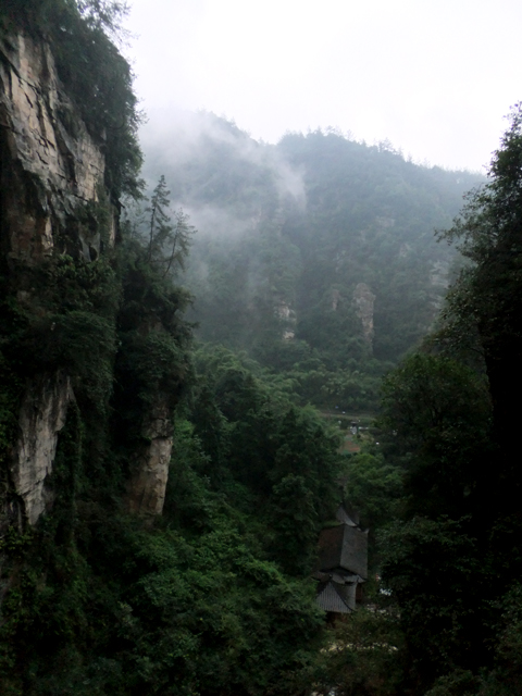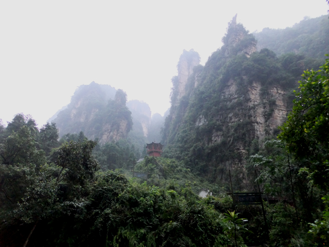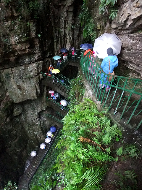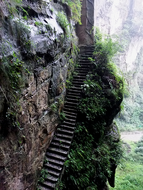 來的時候,大夥登的是好漢坡,回程自免不了漫長下坡路,然上山磨折,下山竟也沒打算輕縱。眼下是條架高於崖谷的長階,依貼山壁彎彎折折而落,稱作「青雲梯」。好在一旁還有護欄,要不一個失足,若非落地化作稀泥,便得棲於密林樹冠,與飛鳥同鄰了。望著谷底透顯的曲繞小徑,腦中卻還印留方才湖景,待回神時,才發覺身畔還有峻險石階往上,無護欄旁依,穿繞著樹苔不知通抵哪裡。當走至山底再回望,亂岩之上竟有座多層望亭,猜測險階終點便是那兒,只不知是否真有勇者挑戰此路進而遠眺。