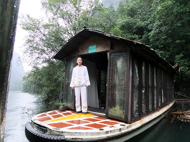 轉到深處,我們又遇見一艘靠岩小舟,這回立於舟尖的替成土家族漢子,音聲同樣高亢,卻換襯上粗豪的遼闊感。導遊此刻倒沒再提什麼對不對上之事,或怕有男團員起身應歌,偏生人家對船漢子也大笑三聲說「對了」,接著飛索拋來將人搶擄回寨,便不知該尷尬還是祝福了。