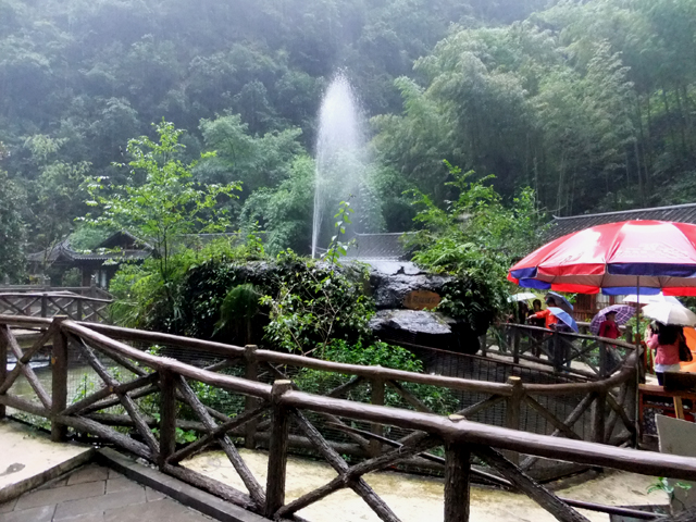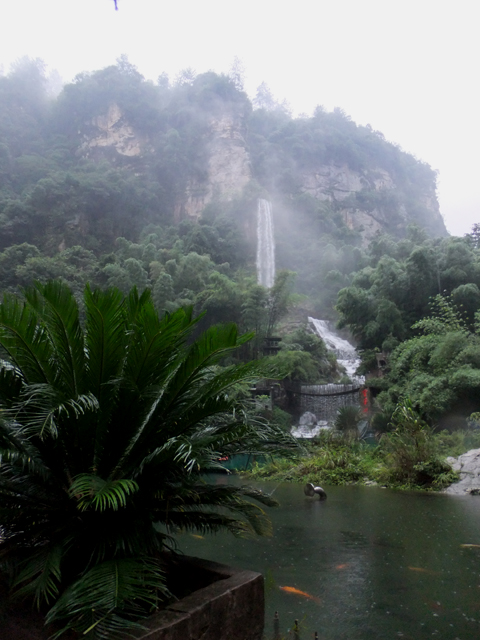 入口附近有個表演台,其面對的山岩似也搭著瀑流雕琢成造景,不過領隊沒將我們帶往那兒與黑壓壓人潮一起攪和,直接沿著崖谷主道前行。攜著會否錯過一景的疑惑,我看著兩旁山色,與昨日大峽谷有點類似,水瀑不願林樹將嶺巖塗抹成碧,不時以迅捷筆勢在山壁狂放揮灑,有時如遁地玉龍,有時成雪色飛髮。激散的水沫在風中幾番騰舞,而後隨滔滔溪河馳向遠方。