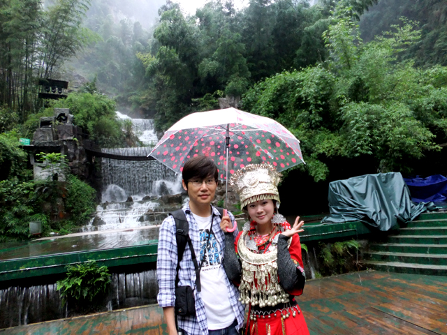 端賞的當口,有個一身苗族華裝的女子婉語和我們攀談,原來也與鳳凰古城那兒相似,欲藉合影賺些零碎錢。我看了看四周,隨著遊客散去,似僅餘她仍於此勤奮尋求機會。節儉的老媽很令人意外,竟鼓動我答應。這女子臉形雖略帶福態,但輕柔語聲與娟秀氣質頗博人好感,沒有先前遇過的那種輕浮俗艷,於是便允諾這樁生意。
