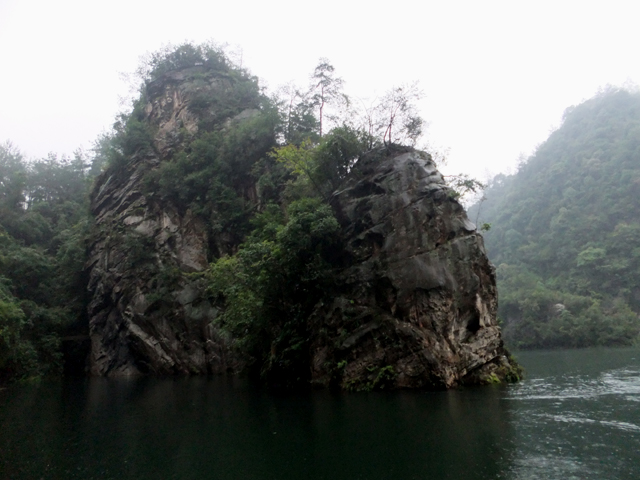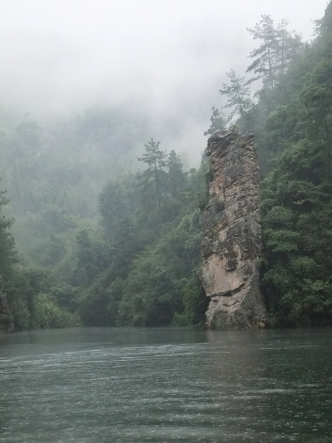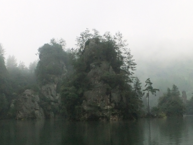 湖區感覺應不算大,但彎來拐去卻令人失了方位,而山石每略換角度,便瞬化為相異樣貌,也難以判定曾否錯身,這麼望著望著,便看見「寶峰湖」標誌性景點了。那是個頎長孤石,步離了山岸,投入湖水的浸擁。導遊說此為「仙女照鏡」,起先我盯瞧半天還抓不到頭緒,許久才恍然大悟,原來我一直以為仙女是全身姿態,故怎麼也畫不出頭頸身段,其實它勾勒的只有髮臉,上部三分之二的縱亂岩面是盤高髮髻珠翠,底部平滑者為其側顏,有微翹鼻尖與頰緣。她低垂眼眉,正戀望自身倒影清容,襯上背後疊層輕漫的山霧,更顯得逸秀非凡。