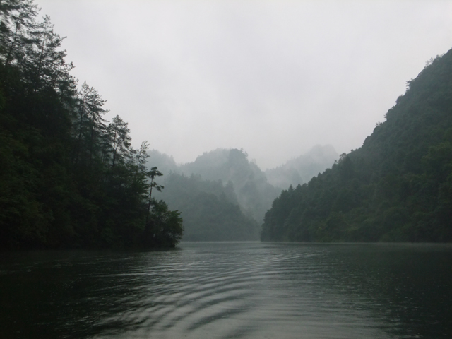 小艇呈仿古設計,綴上挑簷雕欄,乘著漣漪慵懶地將我們帶往湖心。霧色迷茫,令人看不清遠方山景,但也因而織就一種神祕,彷彿於期待中層層掀起千重紗,每前進一分,透顯的都是不同景致。於是我先望見渡口丘陵以懷抱姿態探入湖水,形成門峽,末端賁起的山岩宛若英武守衛,以林樹為槍矛,靜望我們盪入其國度。須臾,岸岩後現出一艘小舟,舟端搭築為亭,一位土家族少女彩衣綴身,哼起高亢歌謠,不需絲竹作襯,嘹亮音聲在湖谷之間自顯其純淨。