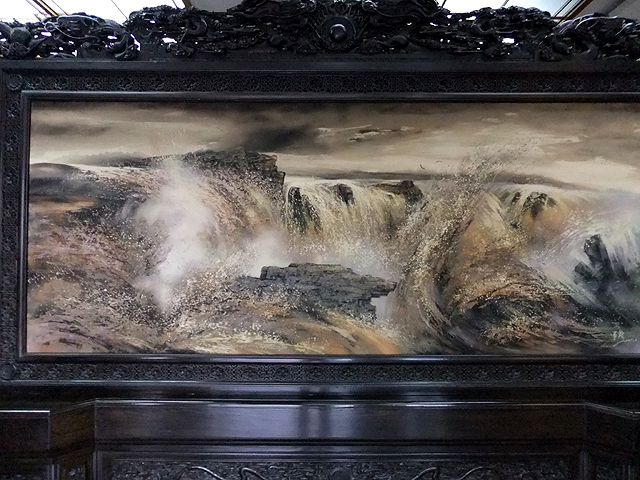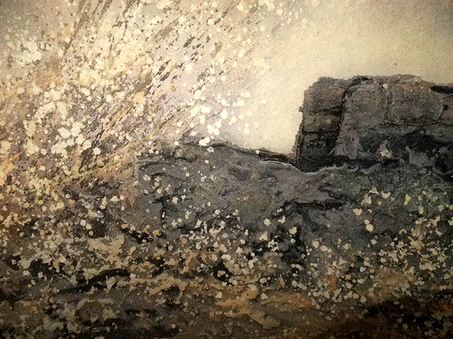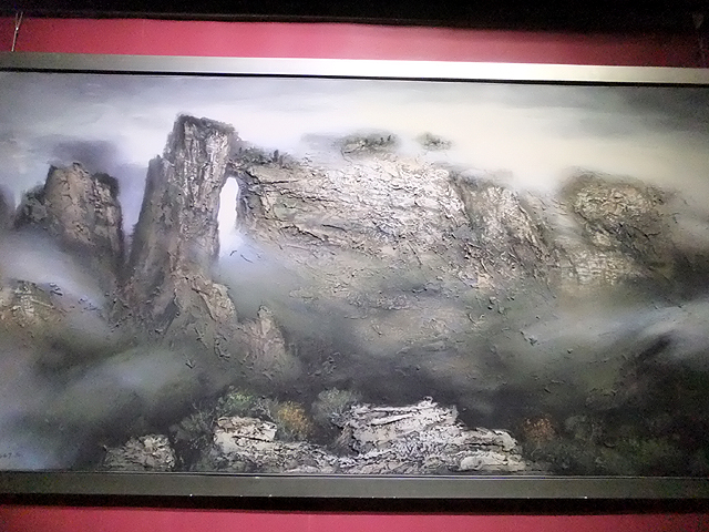 才進大門,便見一幅屏風大作品橫展而開,波濤擊石,灰黑散岩間水瀑橫溢,浪花飛激。不知究理的人可能遠遠望去,以為是尋常水墨,喔一聲就轉身續行。但若趨近細觀,那粗糙表面便顯匠心獨具之處。它並非來自筆墨快意揮染,而是用細碎砂石拼構而成,不同大小、不同彩度,繪者以巧勁慧思鋪灑出動躍力道,也用細膩堆疊呈現景物立體層次。沒有實際看到作畫過程,很難想像該怎樣將砂石推抹出筆觸,收集材料是難事,拼組成畫是難事,而要讓它具有水墨靈秀又更是難中之難了。