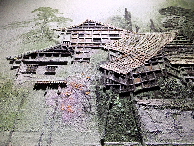 往樓上展館登去,還有各樣大小作品,其一以天門山為主題,石粉積疊成嶙峋紋理,恰顯山勢之偉岸,但那茫茫霧氣推湧至岩洞天光的朦朧,便不知是用怎樣手法揉凝而成了。除了山水,也有些堆築出鄉間生活,可以看到更多材料的運使,樹皮、碎木、枯枝、乾葉拼搭成小巧屋舍,殘舊中透著古樸,這種自然呈現的立體與材質,便是筆墨所不能及了。
