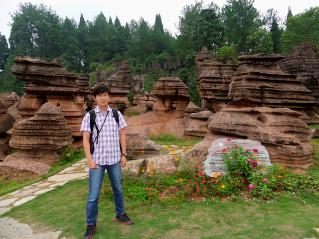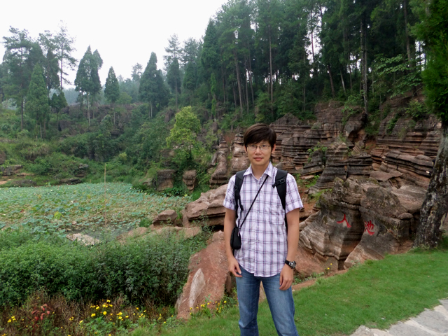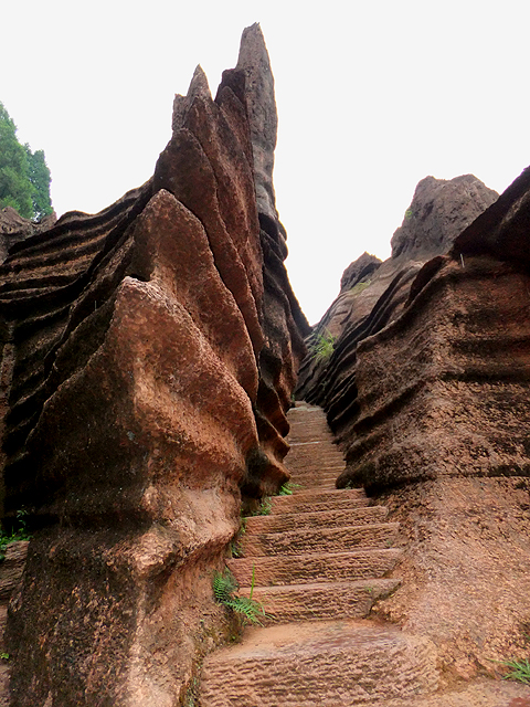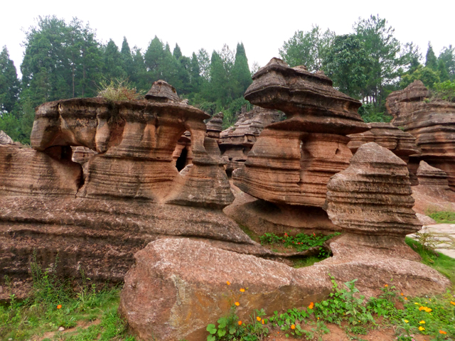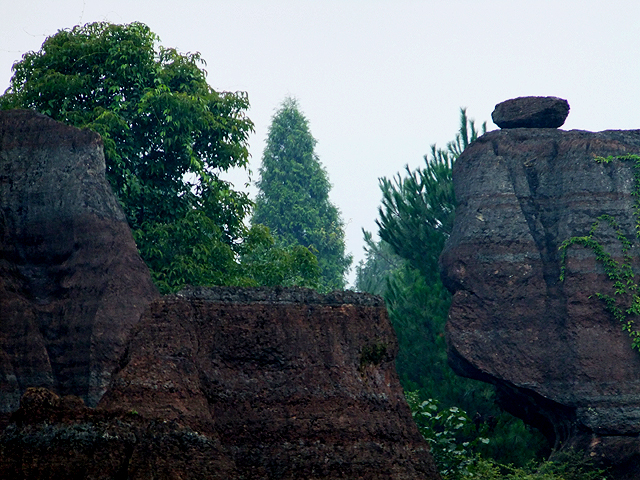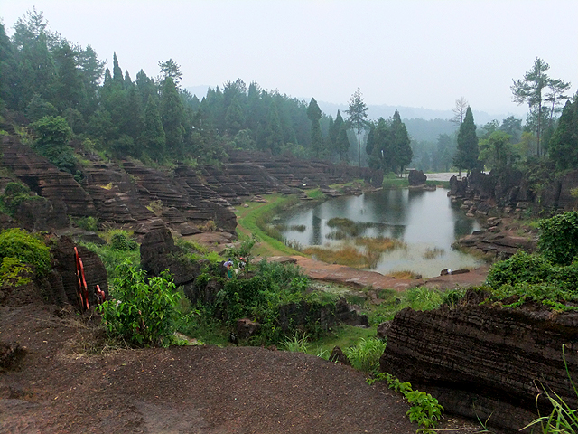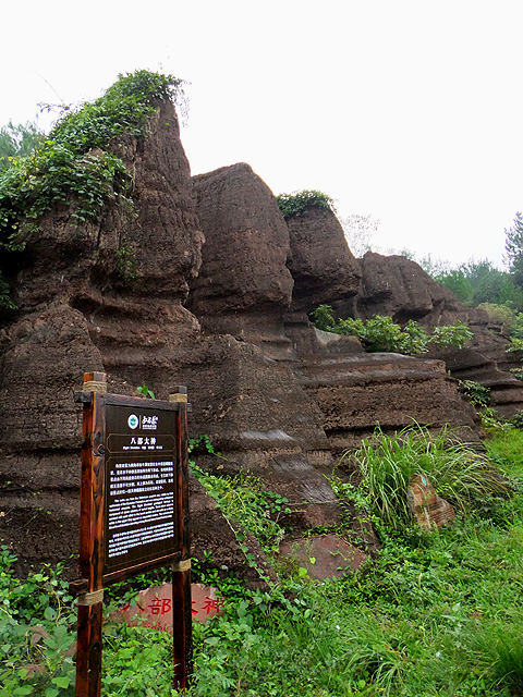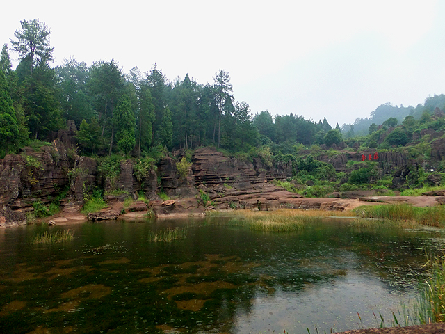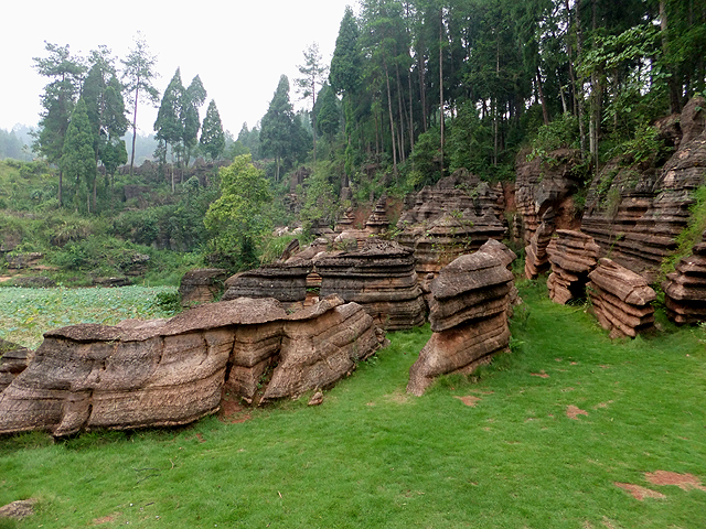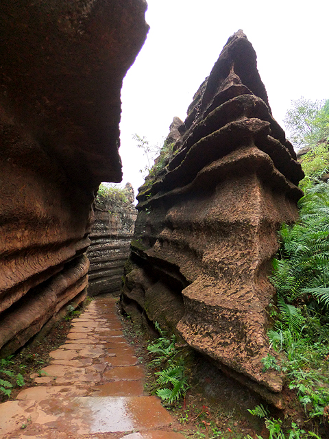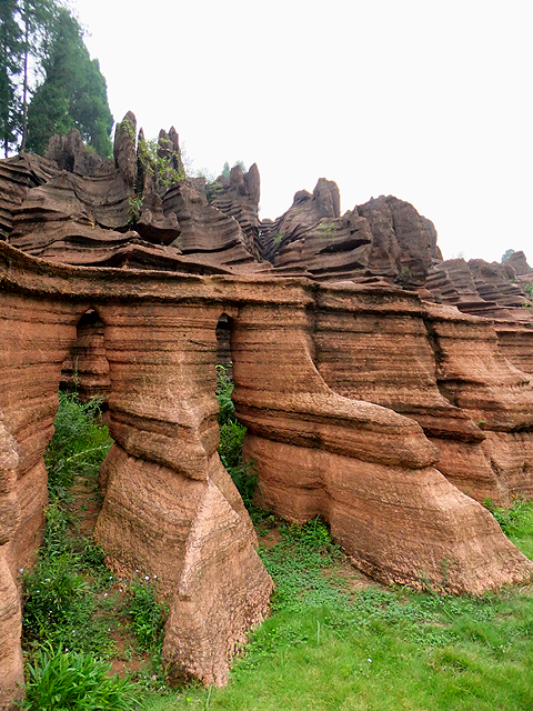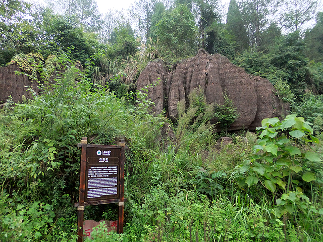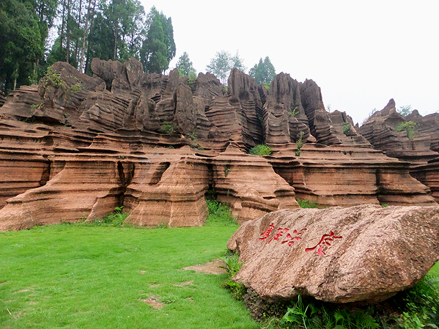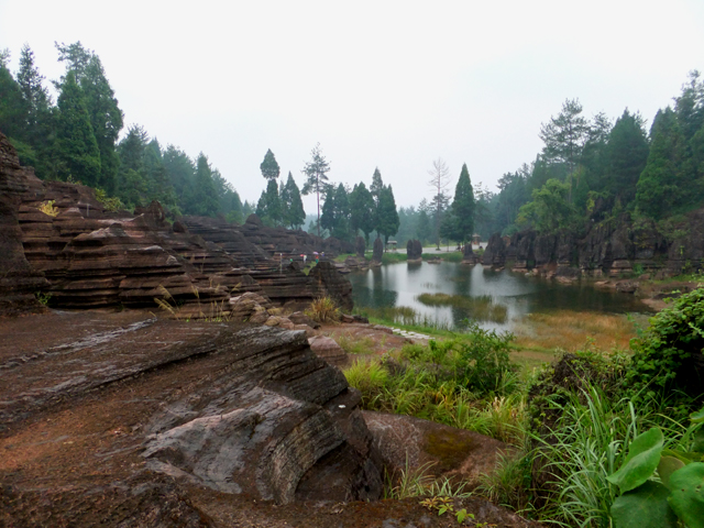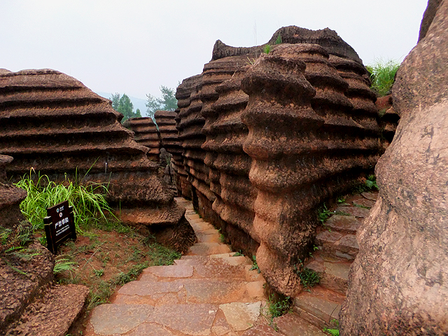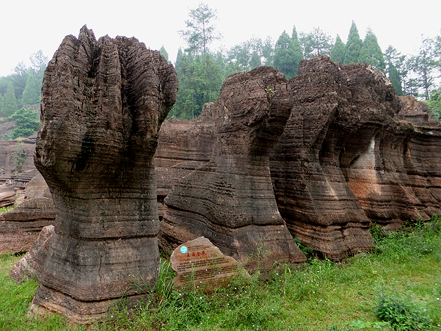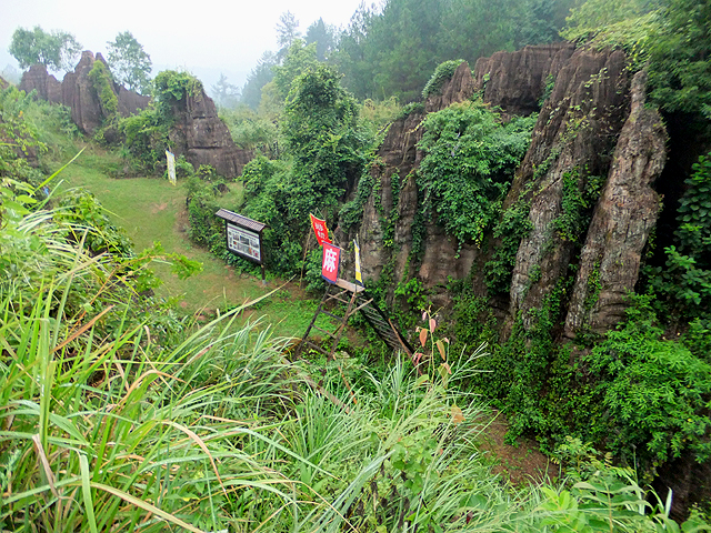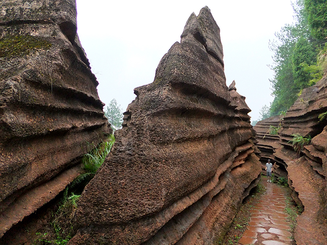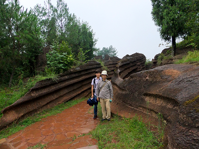 到了景區,接待門面嶄新,但廳裡異常冷清,也好,大夥來這兒不是來看人頭的。走進去,密林與步道間橫生了錯落巨岩,一旁標記著「揚子古海」,點明在遠古渾沌年代,此處是片海底世界,穿梭悠游魚群。因著微雨,赭紅石色被染上些許深褐,導覽小姐說,若是晴朗天,會看到一片艷麗紫紅。雖未見其最美風姿,不過眼前這片起伏石丘,帶著斜切紋理,又因風化侵蝕,被雕琢成略似螺紋的凹凸狀,很是特別。