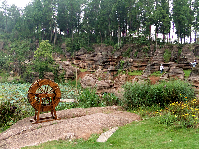 其實也不太知曉岩旁這方池子與人的因由,還是池畔那空置的木輪水車便是牽強連結呢?不過池裡此刻荷葉田田,暗示我們與其嬌顏綻放之期錯身,若早來一個時節,想必應有著粉嫩瓣蕾飄舞風間。